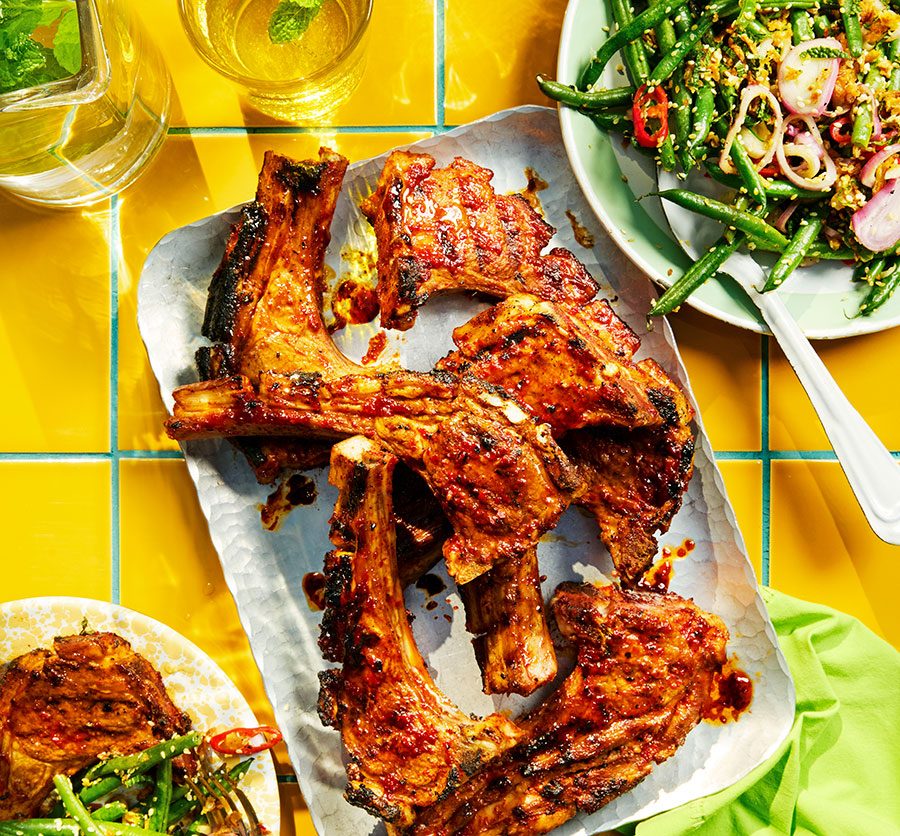 BBQ gochujang lamb cutlets with toasted green bean & sesame salad