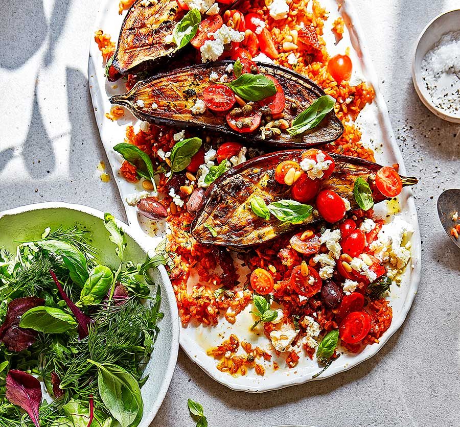Enjoy these glorious roast aubergines with tomato rice and feta for a summer supper or al fresco lunch. You could also barbecue the aubergines, if you like.