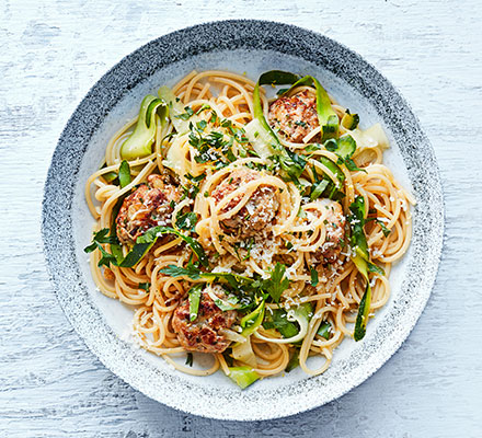 Make a quick and easy meal for two with these meatballs, served with spaghetti, courgette ribbons, lemon and parmesan – perfect for summer evenings.