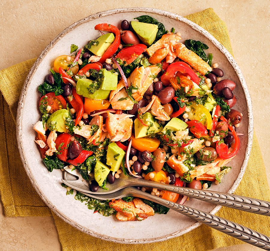 Enjoy this epic salad with pan-fried salmon tossed with giant couscous, black beans, baby spinach, avocado and peppers. It’s high in protein and fibre.