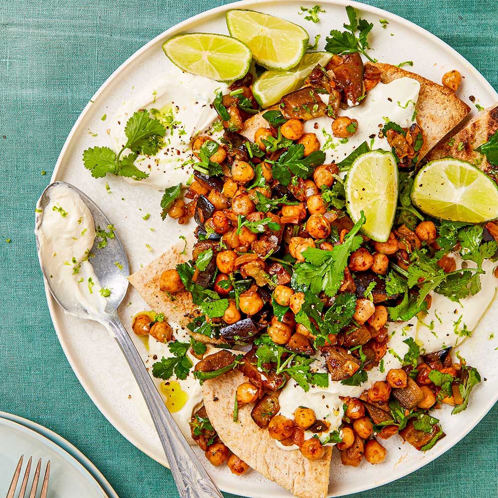 Give chickpeas and aubergine a spicy kick with chipotle. Serve on top of pittas with tahini and crème fraîche and finish with lime wedges and coriander. To read the full recipe, click here.