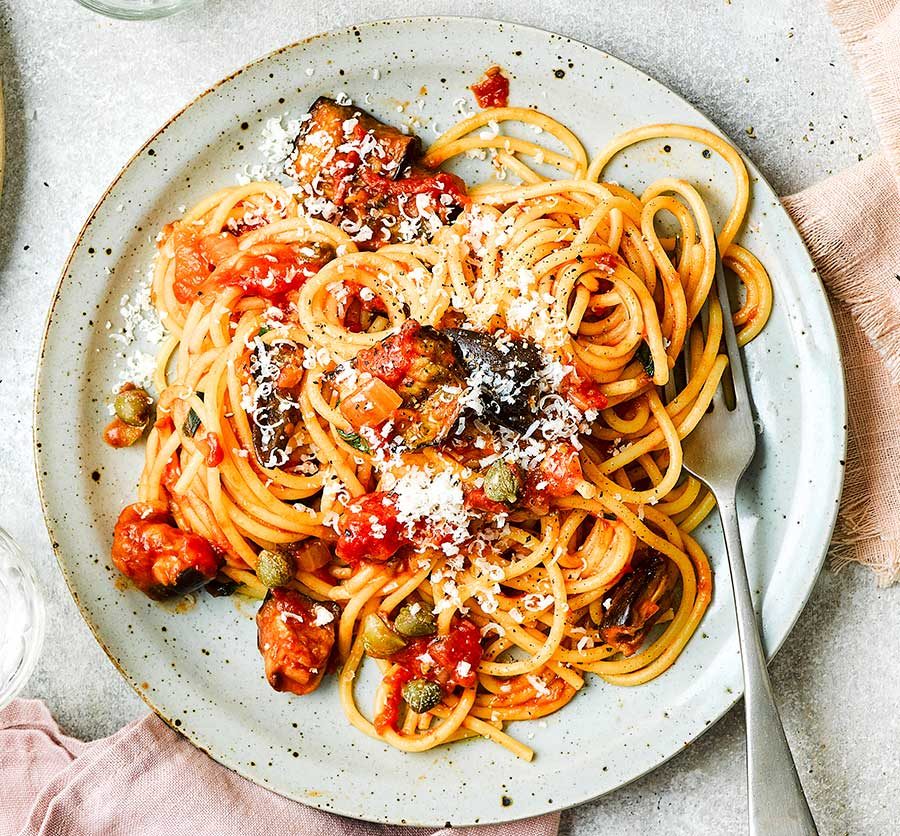Try this easy version of an alla norma, which uses roast aubergine instead of fried. It’s then tossed with spaghetti and a rich tomato and basil sauce. To read the full recipe, click here.