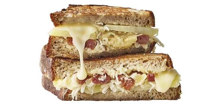 Make the ultimate toastie with potato, gruyère and reblochon cheese, bacon lardons, sauerkraut and sourdough bread. This is easy comfort food at its best.