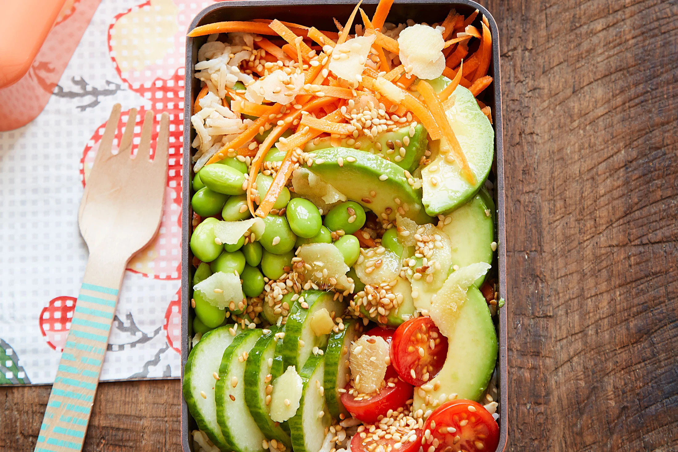 This vegan-packed lunch is full of goodness, using fibre-rich wholegrain rice and protein-rich edamame beans with a tangy tamari and sesame dressing