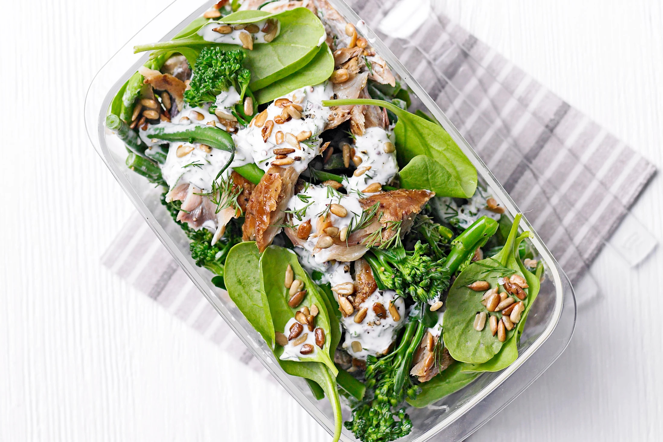 Green beans, spinach and broccoli make a great base for a healthy lunchbox treat with oily fish and yogurt dressing