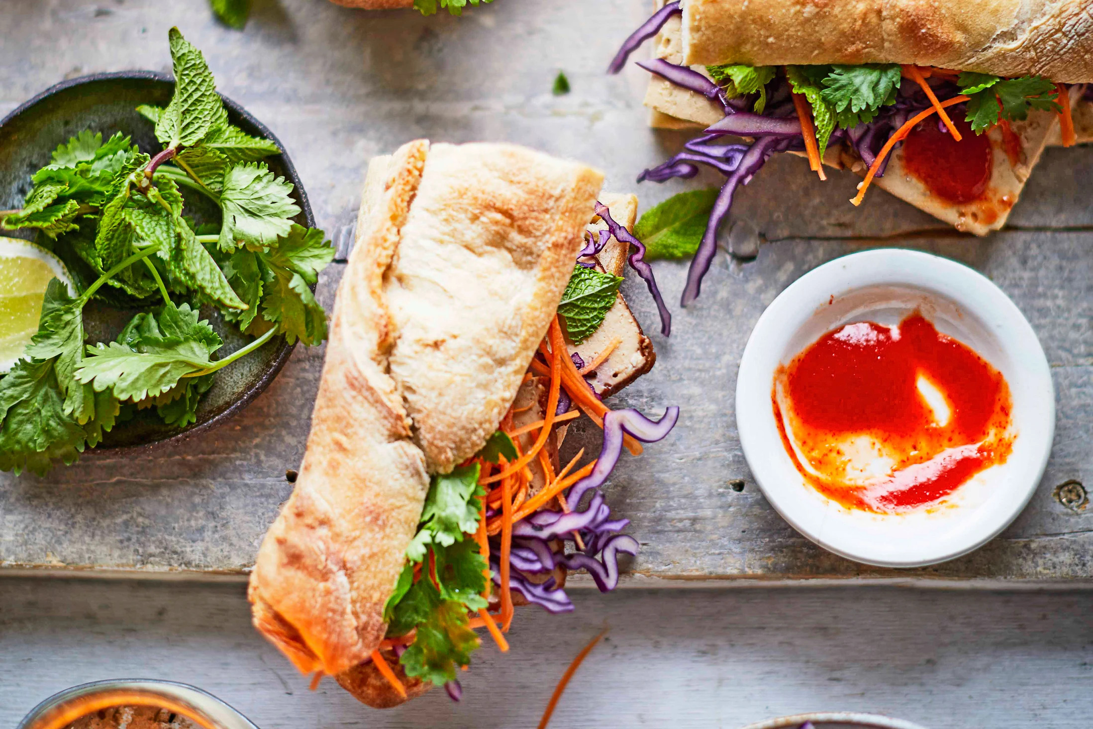Make this decadent vegan sandwich using veggies and hummus with an Asian dressing and hot sauce all stuffed inside a baguette. Moreover, it is great for a filling lunch