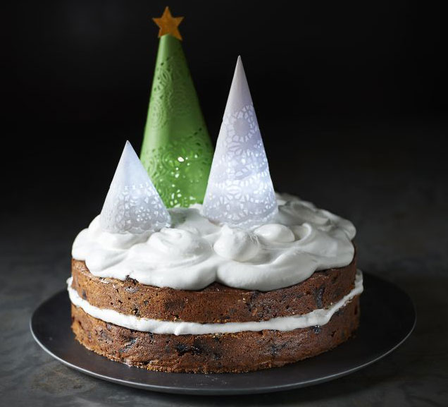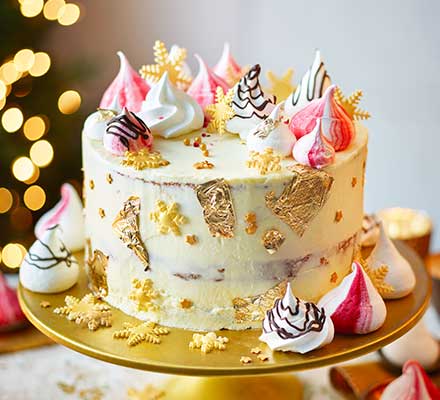 Try sponge instead of fruit cake this Christmas. Our white chocolate cake is a crowd-pleaser and you can buy the meringue decorations, or bake them yourself.
