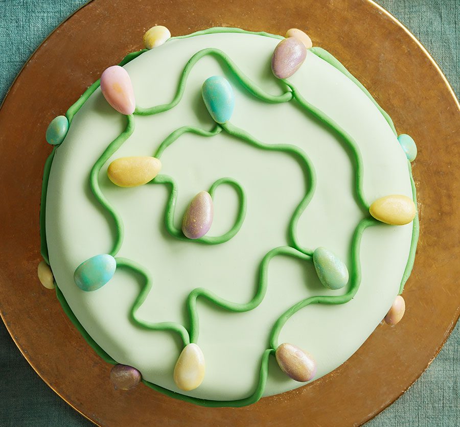 Wow guests with our fairy light Christmas cake topping, made with fondant icing and sugared almonds. You could also use jelly sweets, if you like.