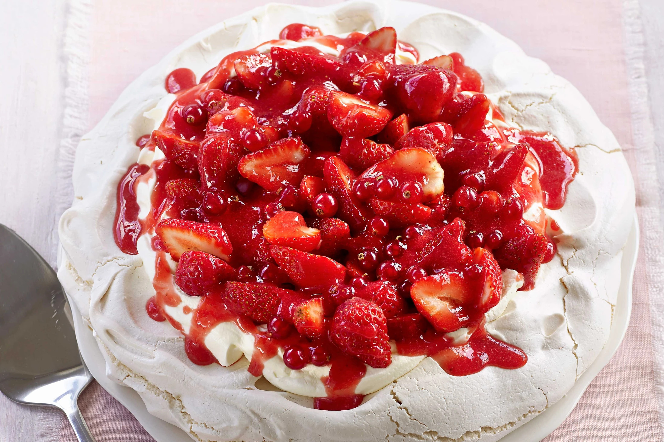 This impressive dessert is the perfect way to use up a glut of fresh berries. Whisk up a light and airy meringue, baked to perfection for a delightfully crisp exterior. Pile the centre high with fluffy whipped cream, and then comes the real star: a cascade of juicy chopped strawberries and tart redcurrants. To finish, drizzle with a vibrant strawberry purée, creating a symphony of summer flavours in every bite.