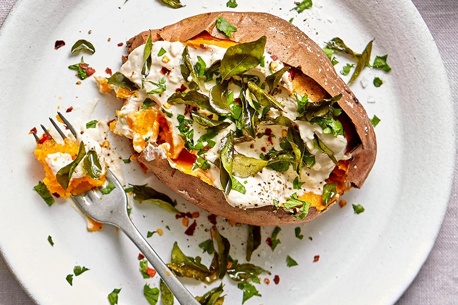 Make the most of your air fryer and try these low-effort sweet potato jackets. Top with tahini yogurt and curry leaves for a no-fuss meal.