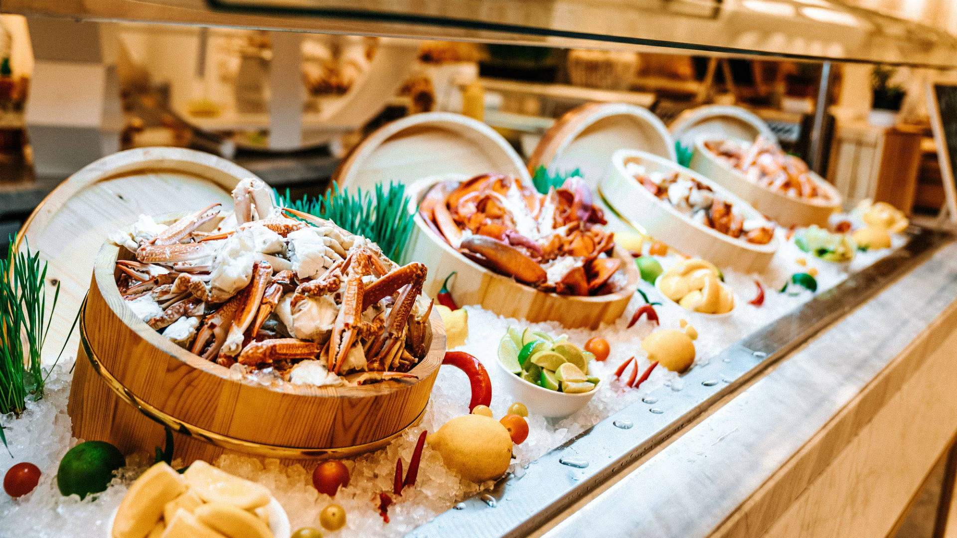 Visit Giornotte on Saturdays for a vibrant atmosphere with live entertainment while indulging in an array of international delicacies, featuring glistening seafood displays, carving stations, and decadent desserts.