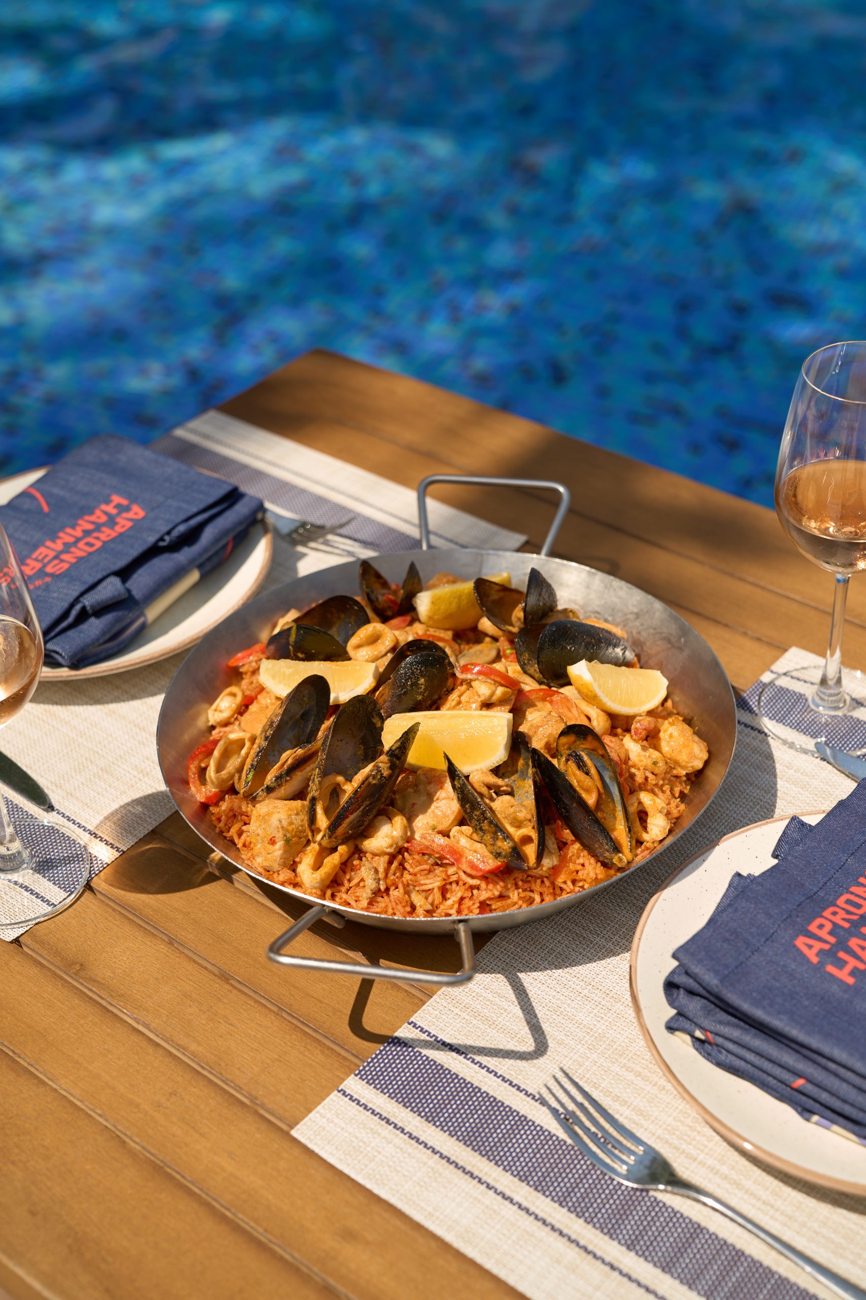 The Aprons & Hammers experience extends beyond the delicious food. The venue offers a complete seaside escape, perfect for families and groups seeking a fun and vibrant atmosphere. The modern coastal aesthetic, adorned in blue and white hues, captures the beachside vibe even indoors. Relax under the stylish pergola, or cool off by the inviting pool – a perfect summer destination amidst the lively Palm Jumeirah scene. Just steps away, unwind on sunbeds with breathtaking views of the Arabian Gulf.