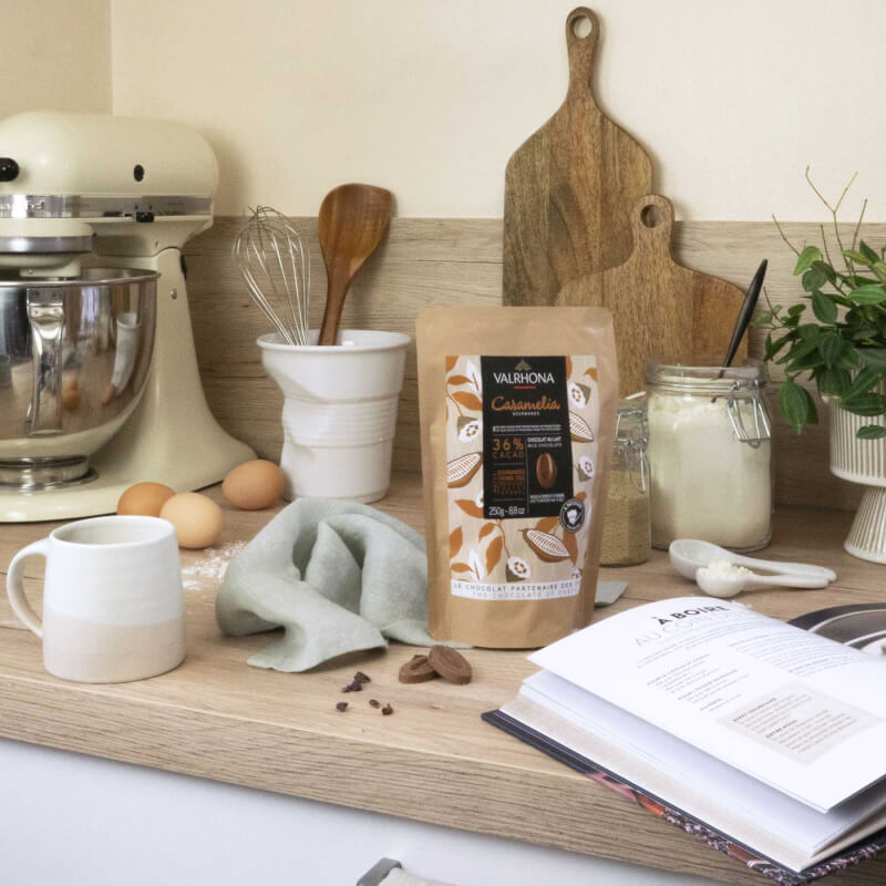 - Garnish the bottom of a 29cm (W) x 4.5cm (L) x 5cm (H) cake mould with the base of the cake. Add pieces of the chocolate Feves Caramelia 36 per cent over. You need about 35g of Feves Caramelia 36 per cent per cake. Cover the top with the mixture.