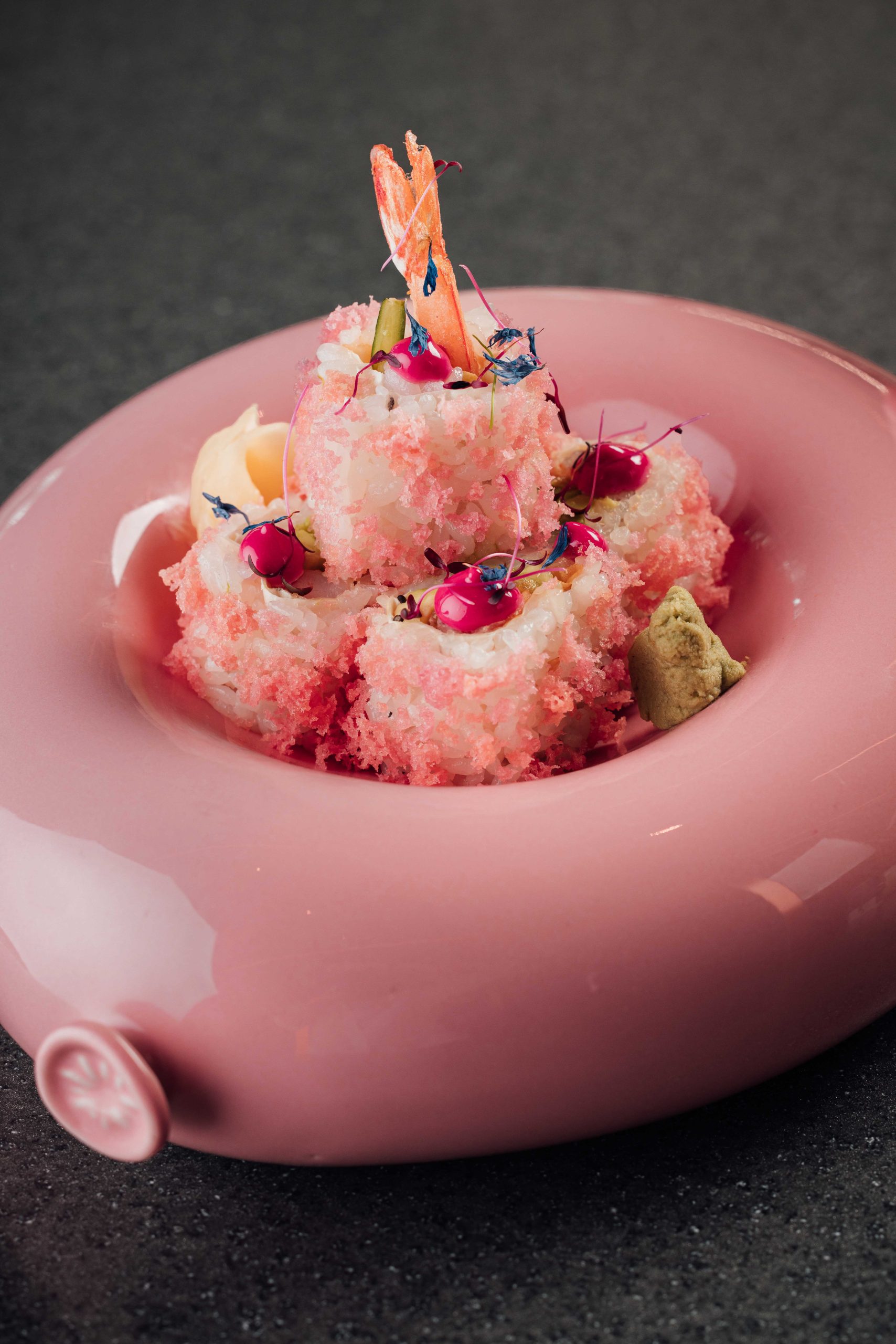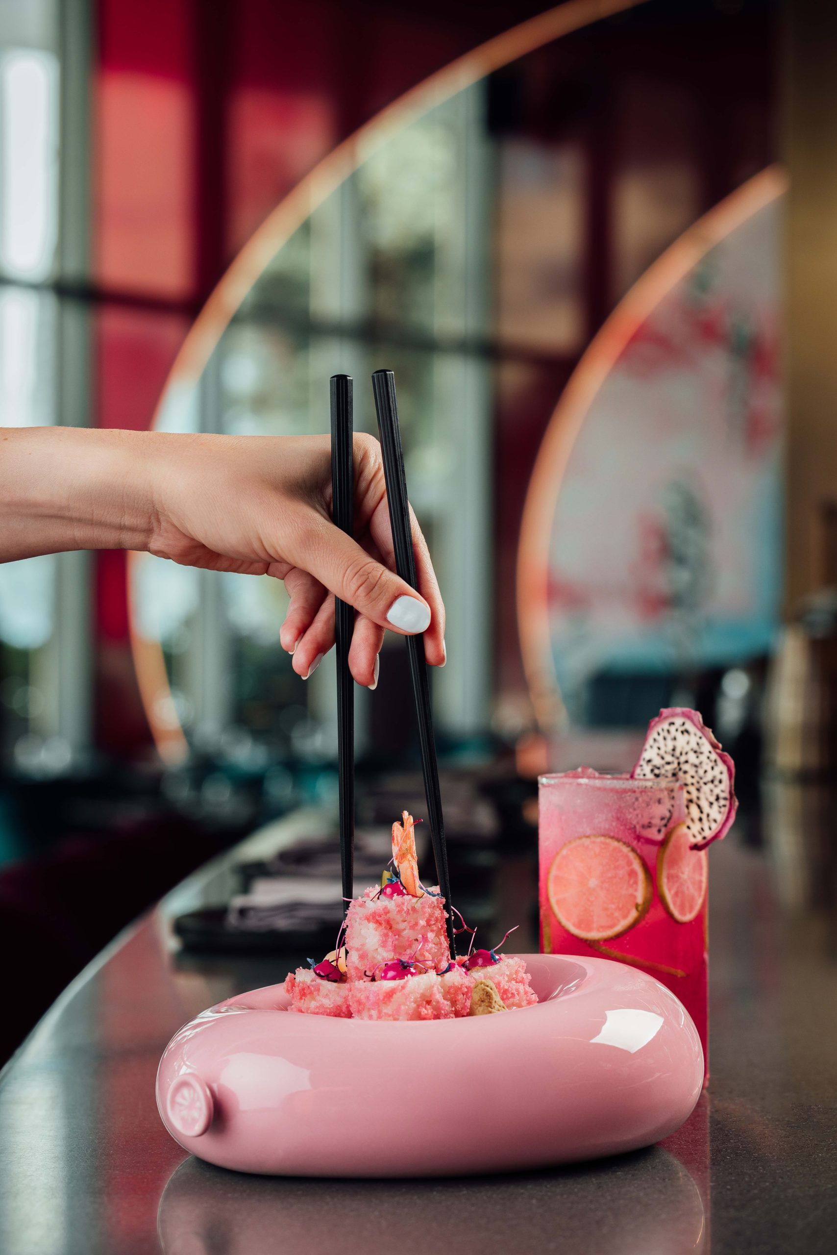 Meticulously prepared, the Pink roll showcases a graceful medley of salmon, prawn tempura, and avocado, presented on an endearing balloon-inspired plate. Enjoy the indulgent dish with KATA’s sparkling Barbie fizz!