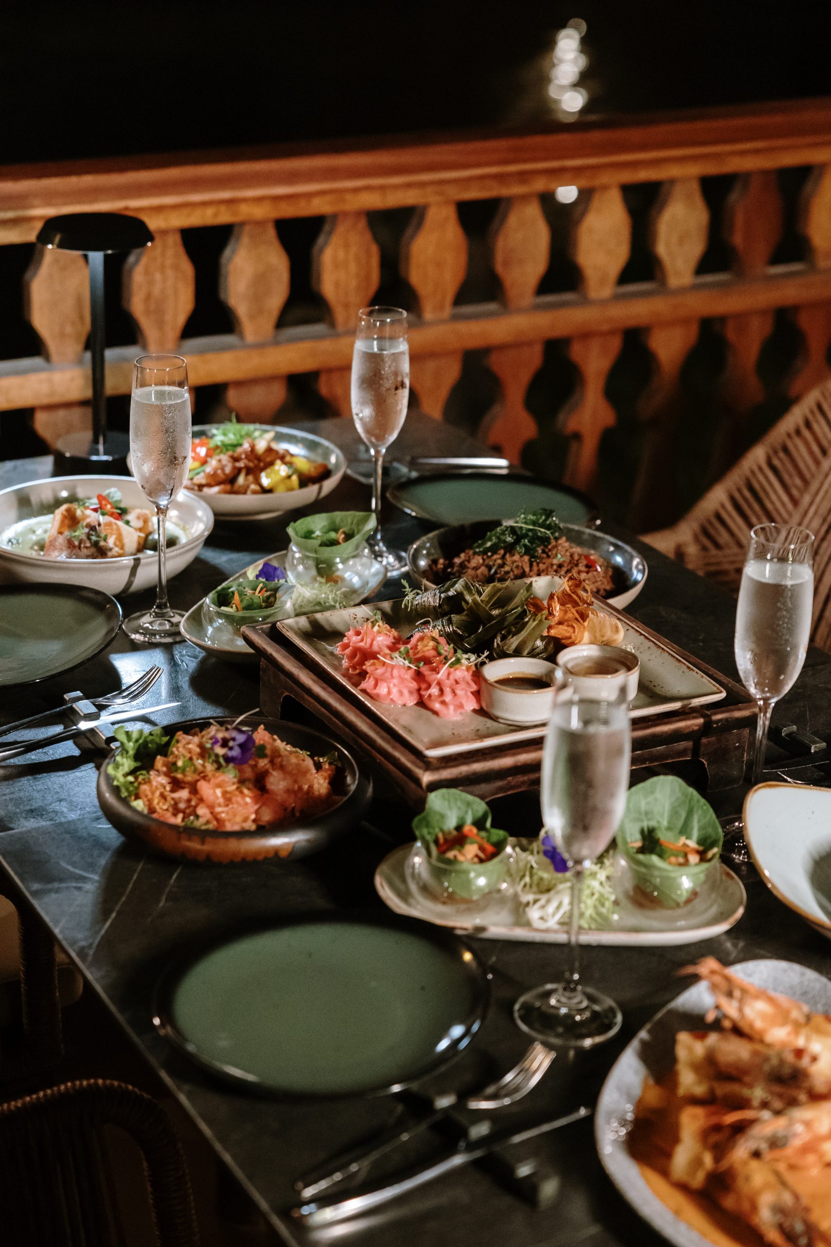 Guests can choose to dine indoors or outdoors and enjoy a thoughtfully crafted five-course Thai menu paired with their preferred beverage package. The menu moves from light bites into delicious starters such as Goong Hom Pha (crispy prawn in spring roll pastry), Yam Polamai (a mixed fruit salad with pomelo, mango, strawberry and crispy lobster) and Sate Gai (grilled marinated chicken sate with coconut and lemongrass), followed by mains such as Lamb Massaman, Wok-fried Beef, Grilled Salmon and aromatic seafood, all served with jasmine rice. A Thai dessert platter rounds off the experience.