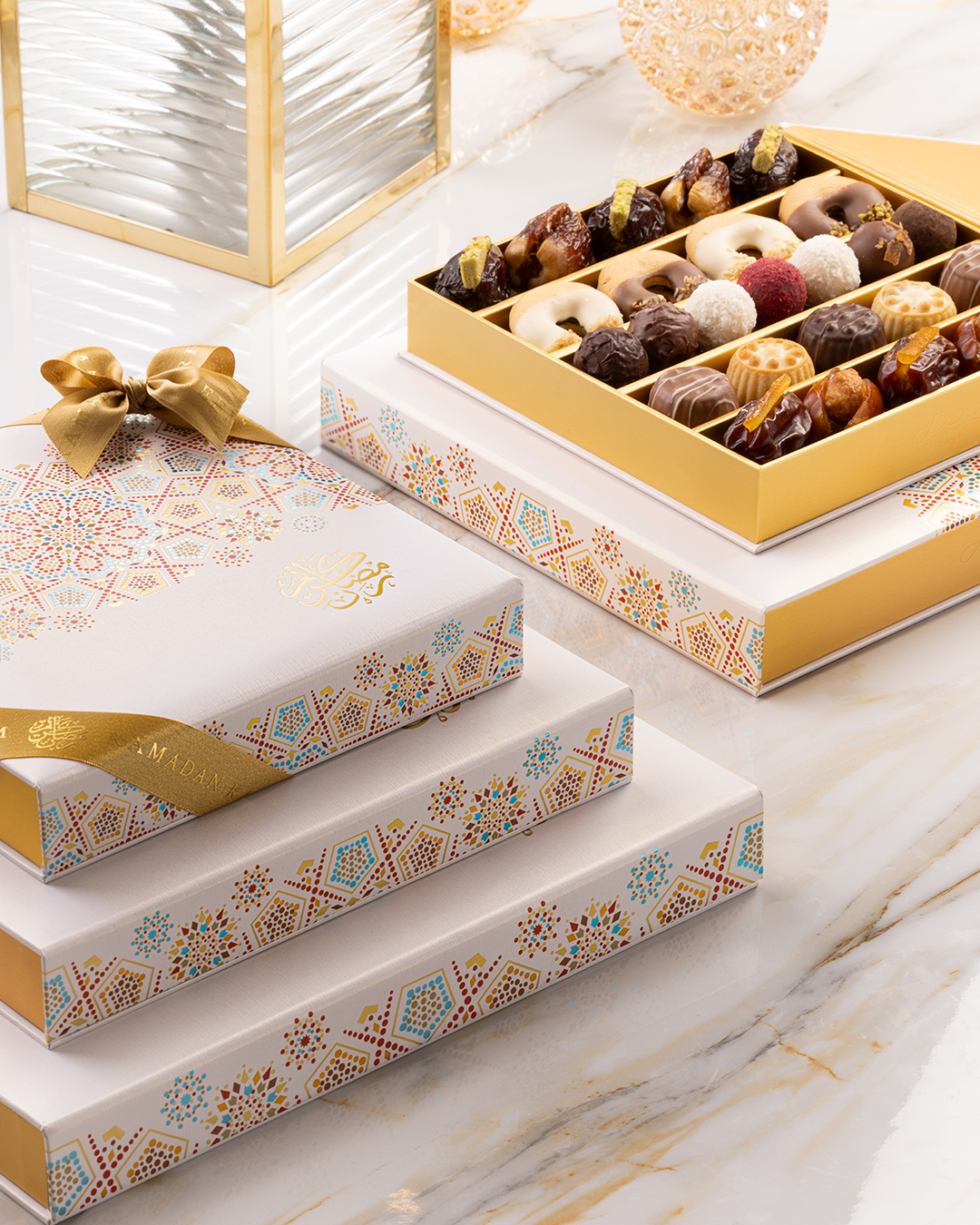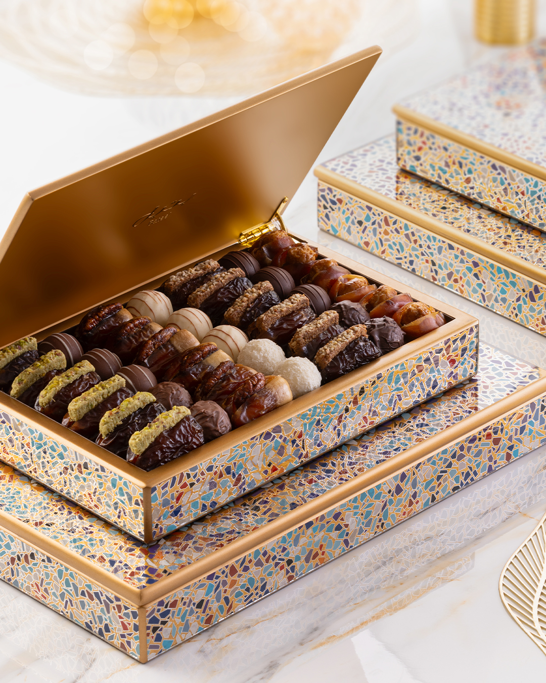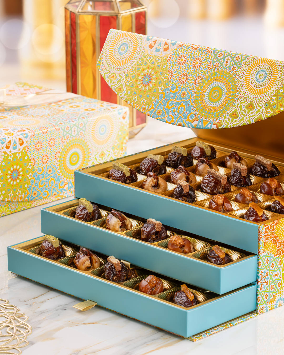 This year’s collection introduces a stunning array of bespoke packaging designed to elevate the art of gifting. Elegant gift sets, including handcrafted wooden chests, vibrant gift boxes, and bespoke trays, capture the spirit of Ramadan with a perfect blend of tradition and contemporary design. Each set can be fully customised with gourmet treats, including date chocolates, truffles, macarons, traditional maamoul, and biscuits.