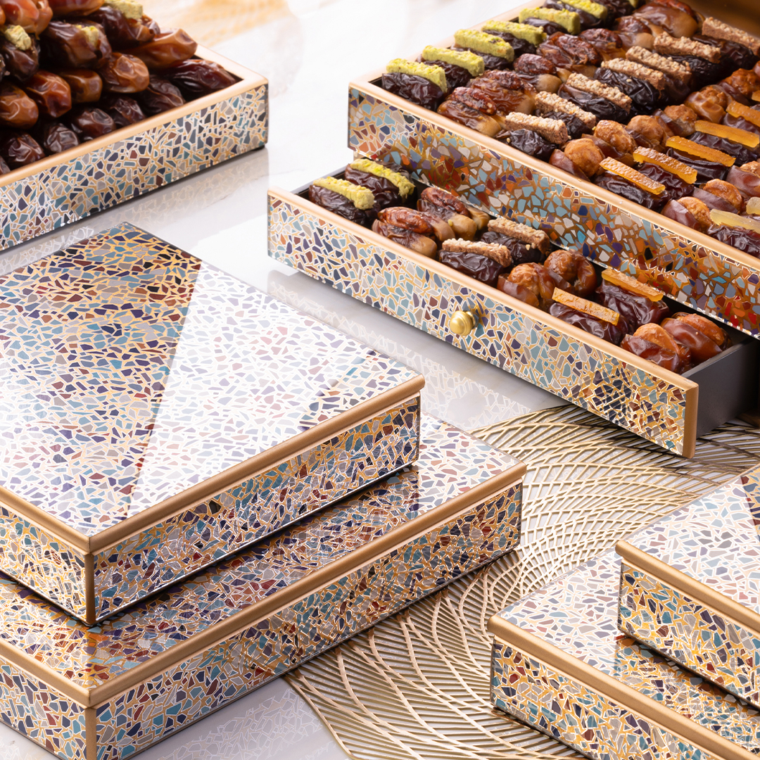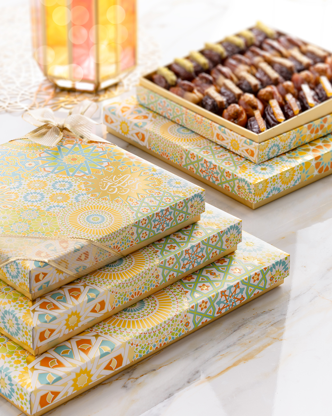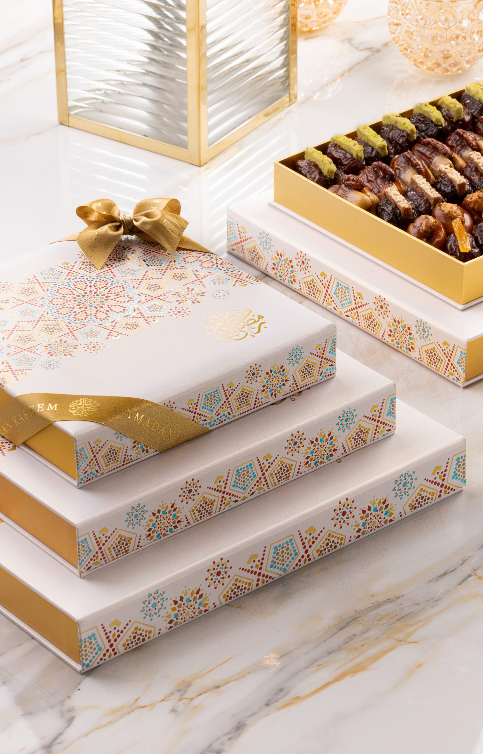 This year’s collection introduces a stunning array of bespoke packaging designed to elevate the art of gifting. Elegant gift sets, including handcrafted wooden chests, vibrant gift boxes, and bespoke trays, capture the spirit of Ramadan with a perfect blend of tradition and contemporary design. Each set can be fully customised with gourmet treats, including date chocolates, truffles, macarons, traditional maamoul, and biscuits.