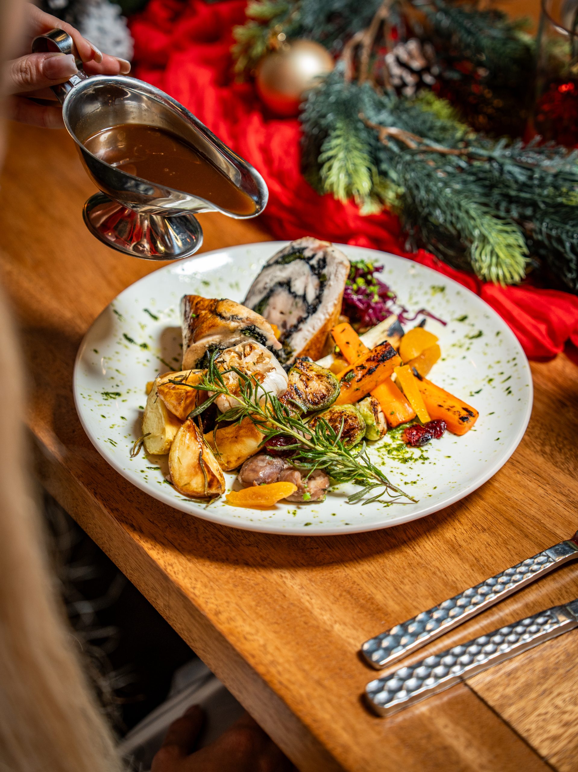 A playful, roast-inspired Christmas Day feast, complete with live entertainment.