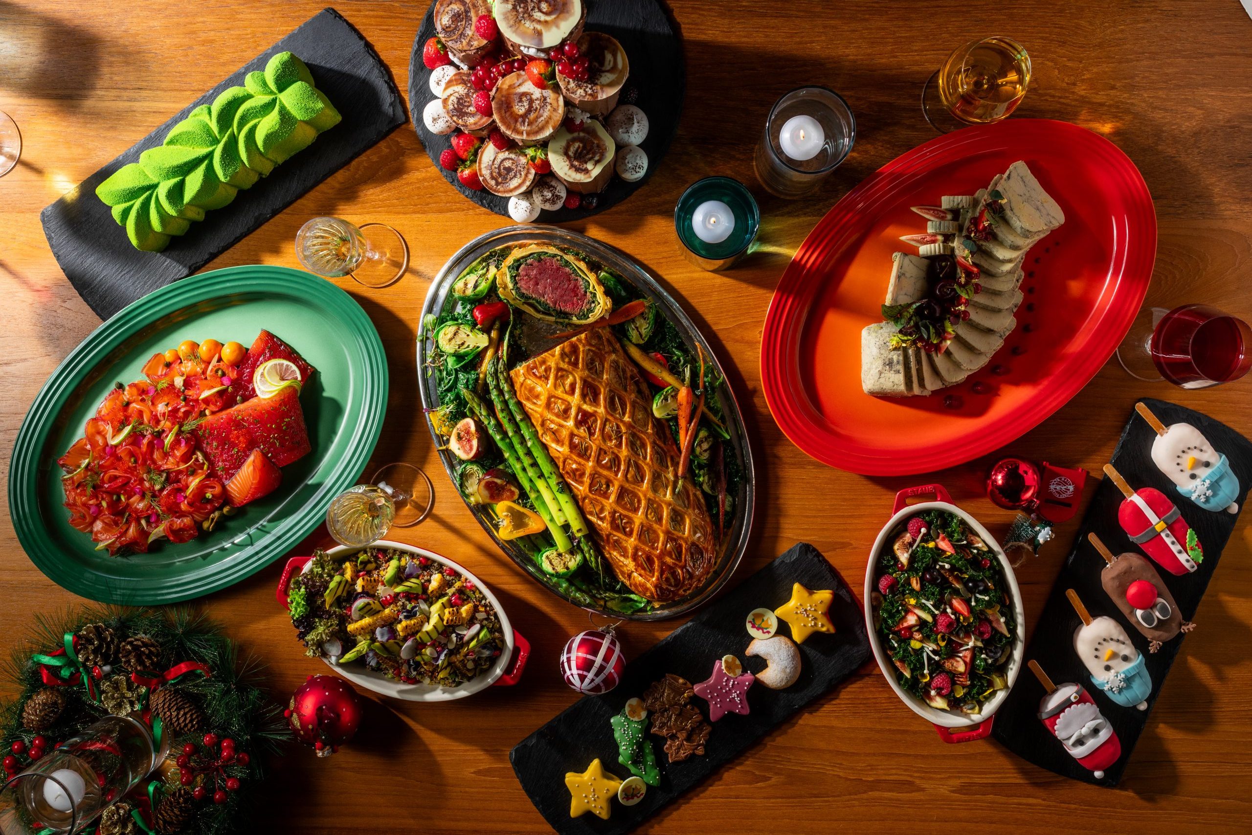 Let your home celebration be effortless this season with an elegant St. Regis spread. Choose from a tender herb-roasted turkey or a whole grilled salmon, each paired with all the refined trimmings, and a classic Christmas yule log.