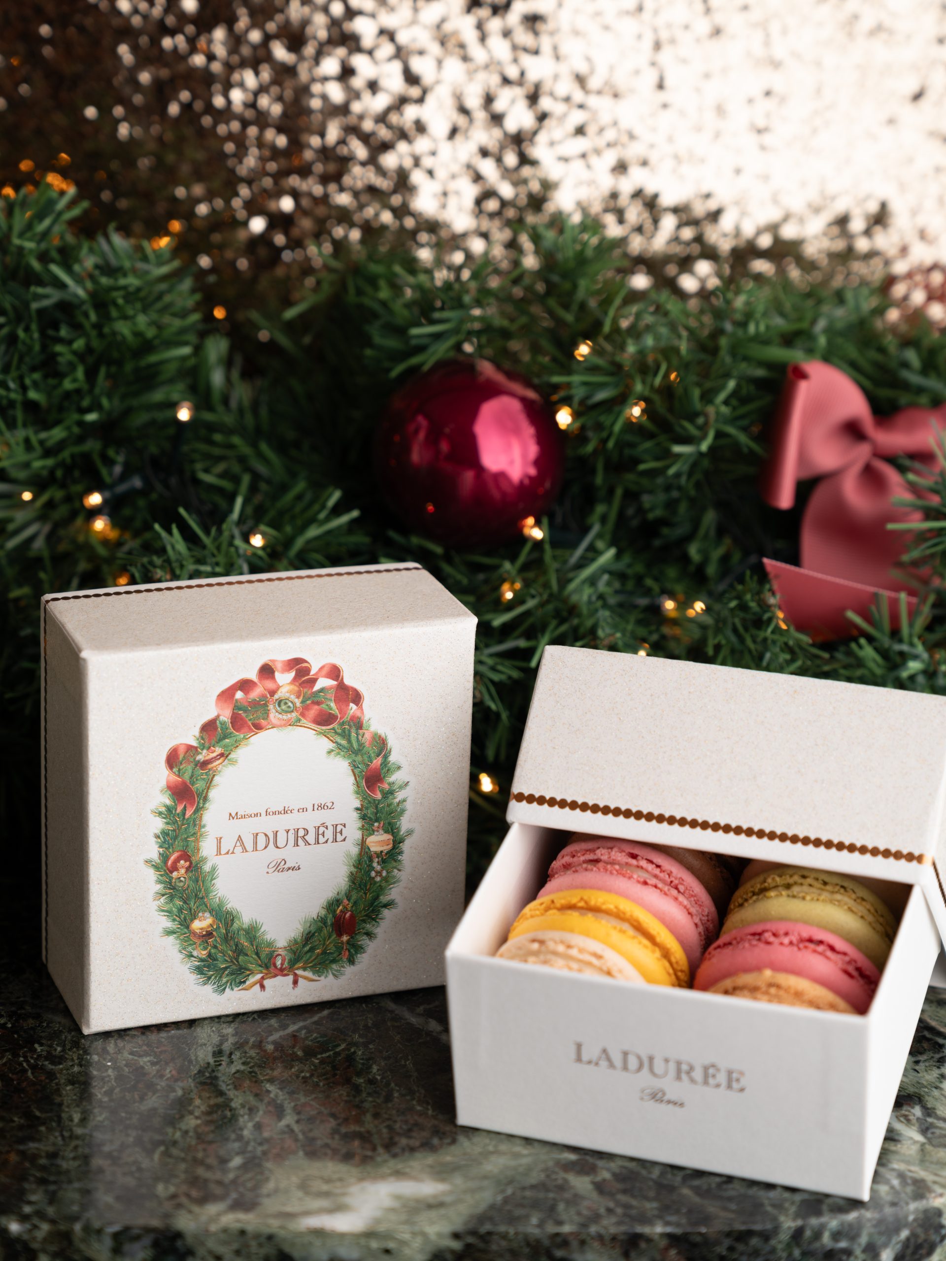 Ladurée brings festive charm with limited-edition macaron boxes adorned in white sparkles, green pine garlands, and delicately tied wreaths. The Speculoos macaron, inspired by lotus biscuits, showcases muscovado sugar cream, caramelized white chocolate, and festive spice hints, while the Nougat macaron offers an elegant blend of irresistible nut fillings in smooth chestnut honey nougat cream. Elevate your holiday celebrations with Ladurée’s Christmas Yule logs, choosing between the enchanting Ispahan or the Pistachio Savoie, each promising delightful flavours and intricate toppings.