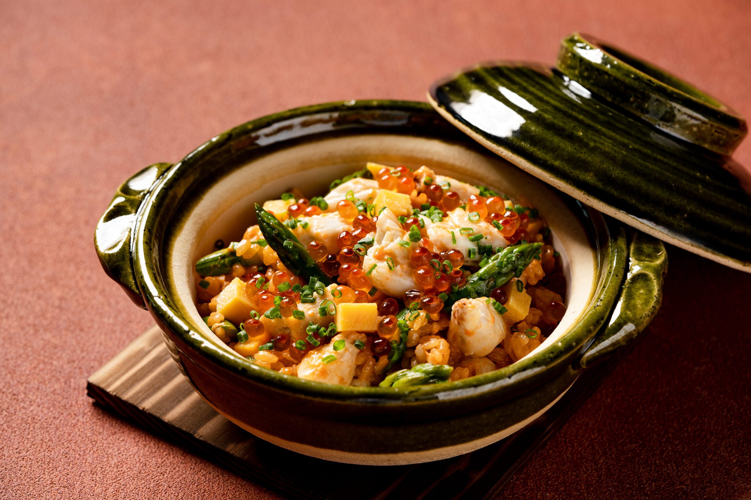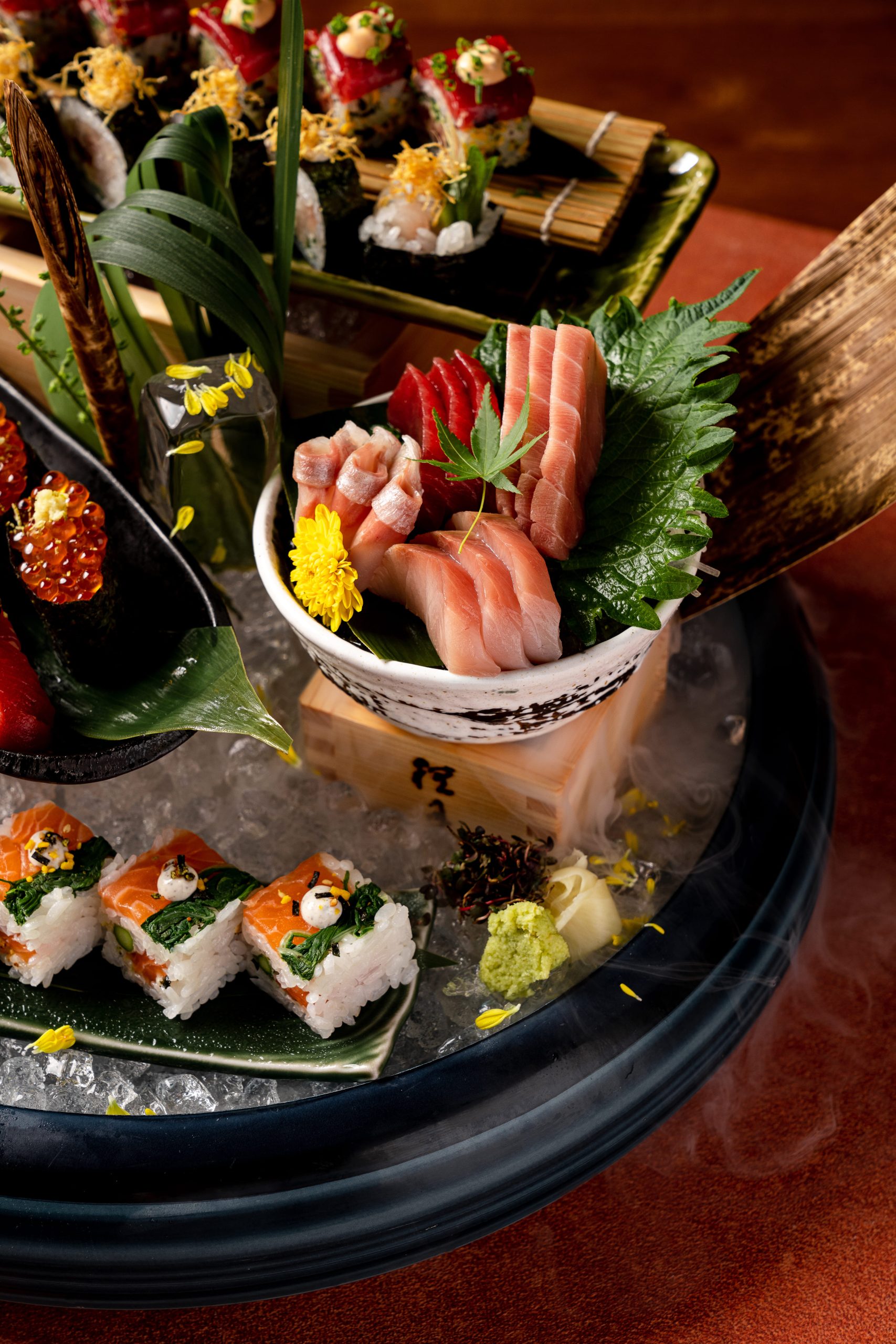 The restaurant’s design features five distinct dining spaces, each with its own atmosphere. One of the highlights is the Toyama Private Dining Room, inspired by Japan’s Toyama region. The room is anchored by a striking 7.3-meter-long synthetic Shimenawa rope—the largest of its kind ever made. This handcrafted rope, which symbolises protection and sanctity in Japanese culture, serves as a dramatic centrepiece above the dining table. The room’s walls and ceiling are adorned with hand-painted silk inspired by traditional Japanese art, including works by Katsushika Hokusai and Utagawa Hiroshige.