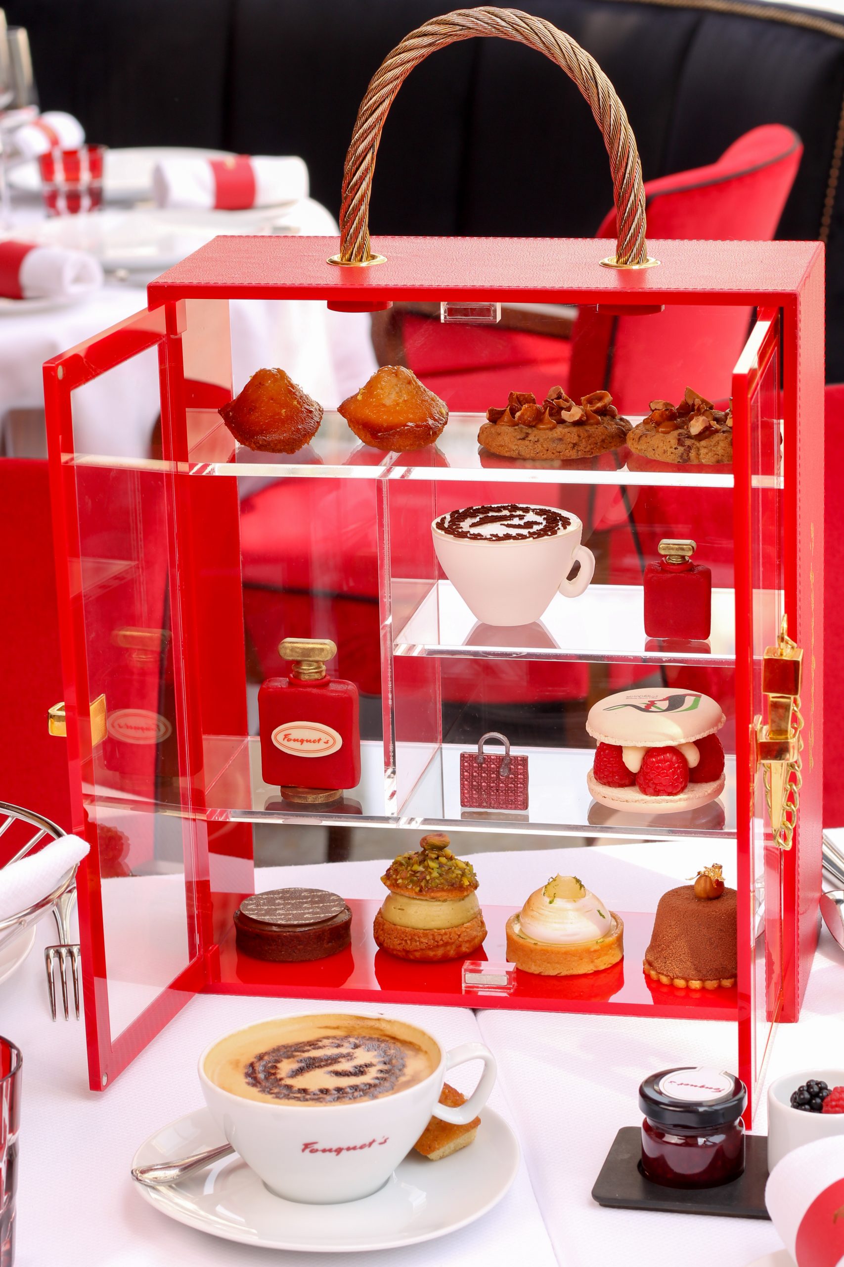Fouquet’s Dubai has introduced an exclusive Le Goûter du Fouquet’s Afternoon Tea for Emirati Women’s Day. Crafted by esteemed pastry chefs, Hugo and Julien, the experience includes a trio of luxurious desserts in a red box. Highlights are a hazelnut praline-filled chocolate perfume bottle, an almond-filled chocolate handbag, and a raspberry-vanilla cream specialty macaron. Guests indulge in an assortment of mini pastries such as macarons, hazelnut fudge, chocolate, caramel, and lemon meringue tarts, while plain and raisin scones with clotted cream and jam add to the opulent celebration.