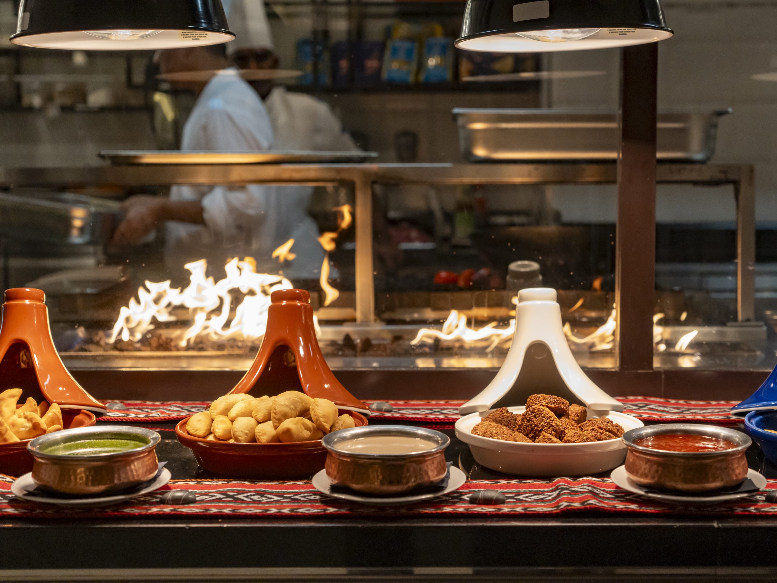 Sunset to 9 pm. Iftar buffet includes soft drinks, Arabic coffee, and Moroccan tea: AED245 per adult, AED125 per child (6-12 years old), and kids under 5 dine for free. Shisha from AED155.