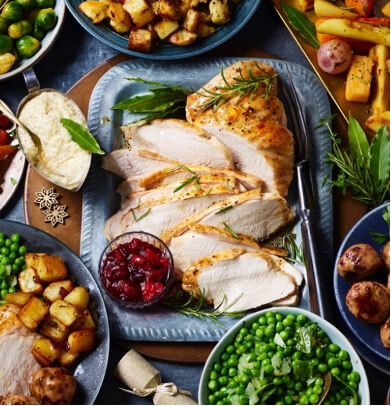 Enjoy a whole roast turkey in the comfort of your home with your family and friends. Expect a stuffing made with sourdough bread, apples, onions, garlic, herbs, raisins and cinnamon; with sides of roast or mashed potatoes, sautéed vegetables, Brussels sprouts, cranberry sauce and turkey gravy. Other mains include a Roast leg of lamb and a Whole salmon; while holiday desserts include a Christmas pudding, yule log and more.