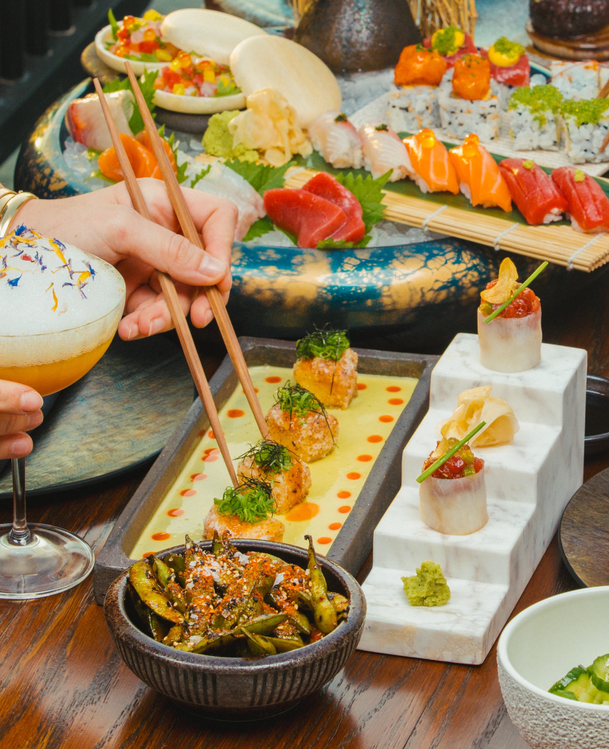 Vegetarians can savour the Denkaku eggplant, which is Josper grilled and served with saikyo miso and brioche, and the baby spinach salad, known as Horenso goma, is drizzled with sesame sauce and topped with aged parmesan. For those seeking something heartier, the Wagyu sliders come with a sunny-side-up egg and A5 wagyu beef on brioche.