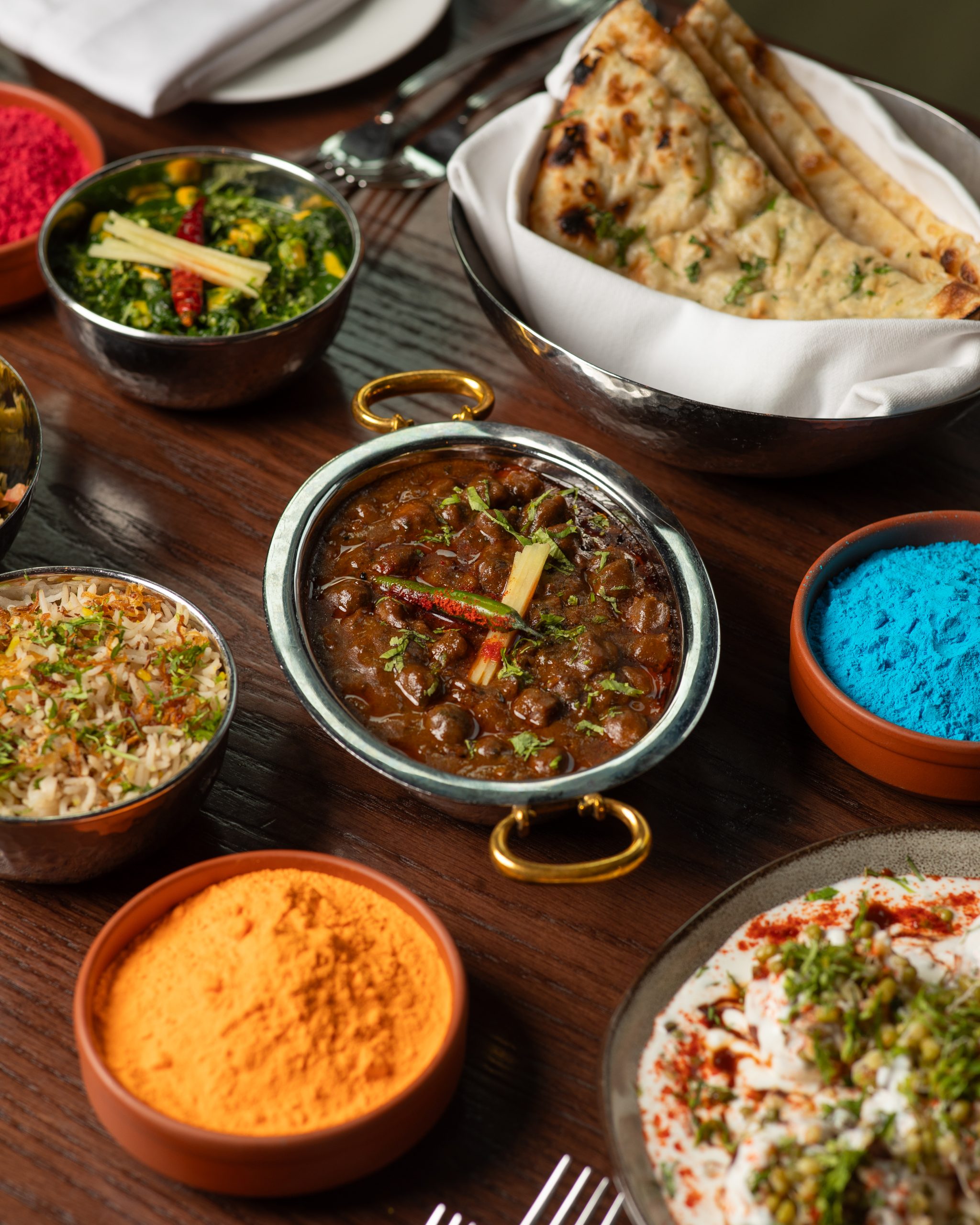 Jamavar Dubai marks Holi with a special brunch on 28 February, 1 March, 7 March and 8 March, served from 12:30pm to 4pm. Guests are welcomed with a Tricolour Temptation drink, followed by small plates including dahi puri and Bambaiya bhel, and a Holi sampler with vegetarian (karare aloo chaat, paneer 65, broccoli galawat) or non-vegetarian options (chicken 65, gilafi mutton seekh kebab). Mains include murgh nihari, Sindhi methi gosht and Amritsari chole, served with palak corn, dal Jamavar, jeera pulao, cucumber raita and assorted breads. Dessert is a thandai panna cotta with rose and raspberry compote, pistachio crumble and saffron.