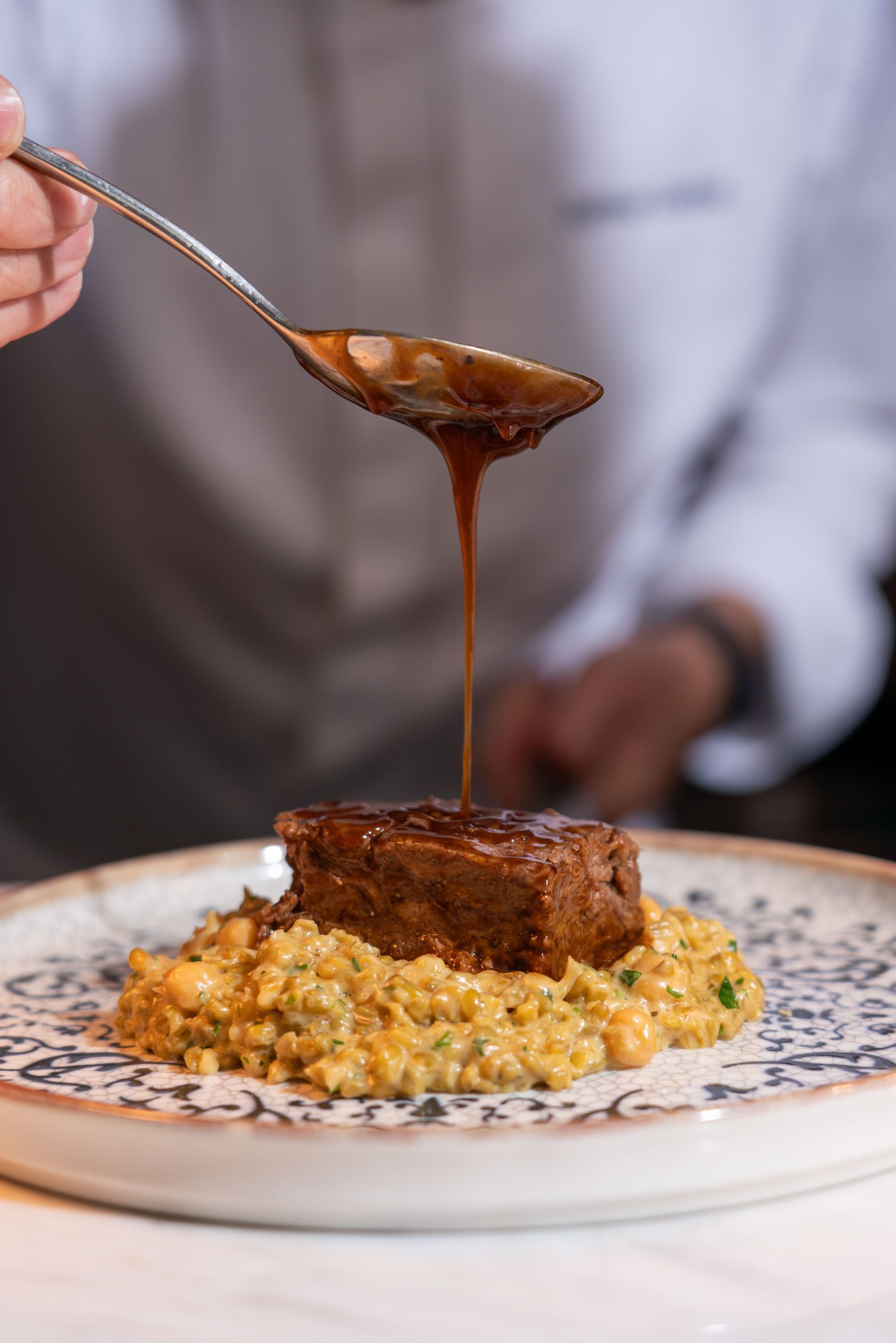 With the first bite, you’ll savour the tender, juicy flavour of slow-cooked beef ribs, perfectly seasoned to bring out their rich, deep taste. The creamy texture of Freekeh adds a subtle sweetness, balancing the savoury meat, while a few fresh mâche leaves offer a light, refreshing note that ties the dish together beautifully.