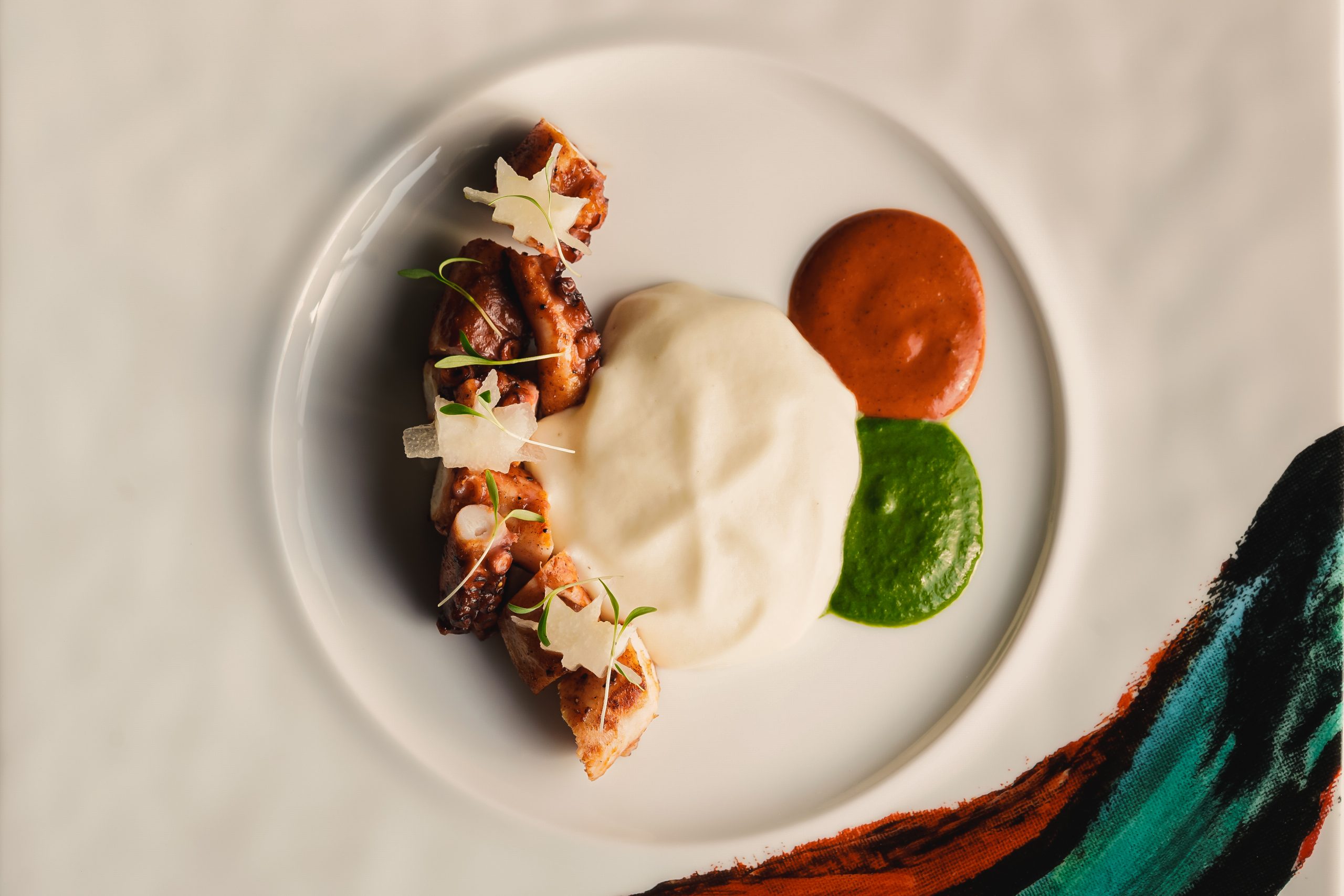 Inspired by Pulpo a la gallega, a simple octopus dish with potatoes and smoked paprika. The octopus is grilled with smoked jalapeno sauce and served with a smooth and creamy smoked potato foam.