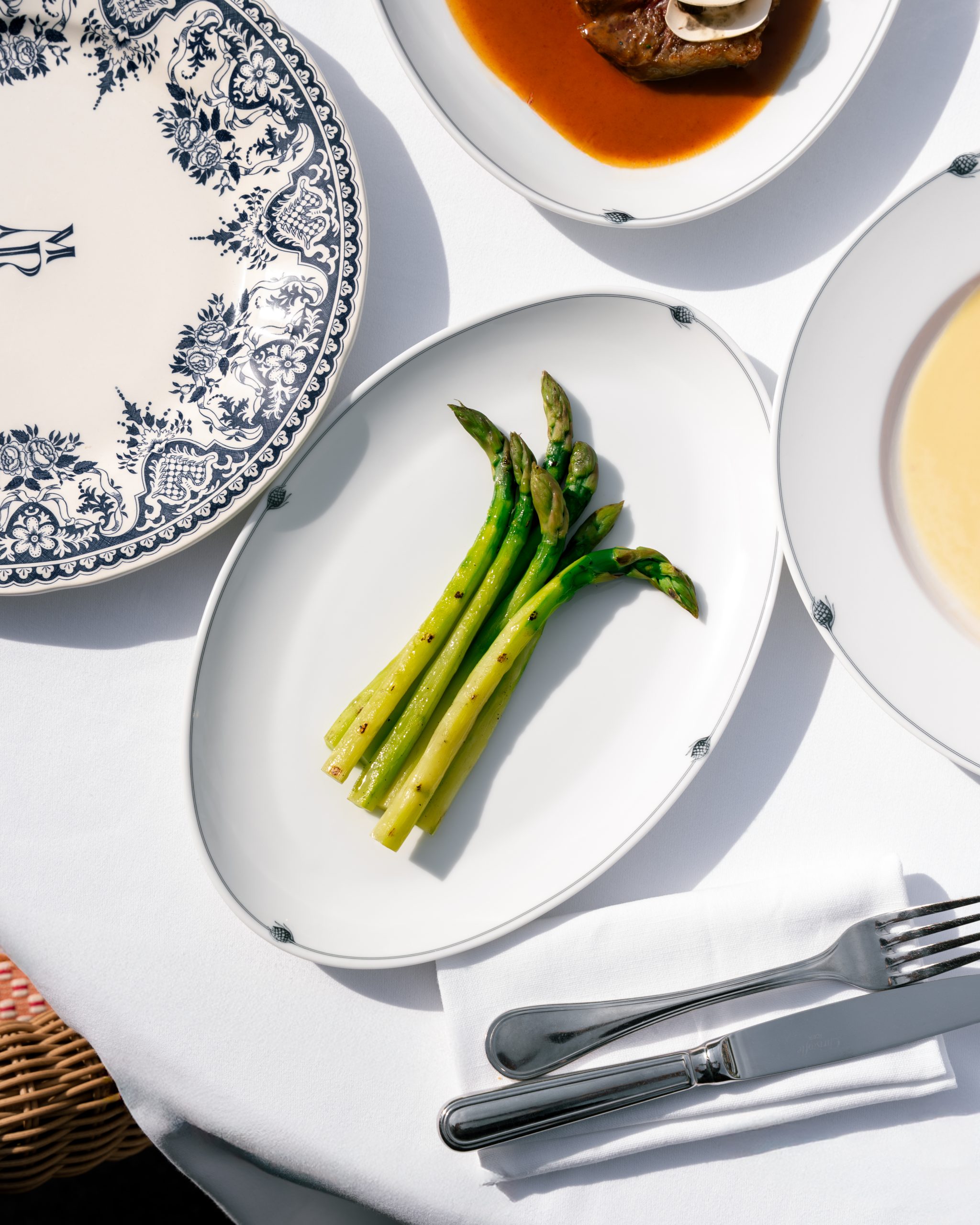 The dish is best served with asparagus, adding a fresh crunch that complements the rich salmon and buttery puff pastry.