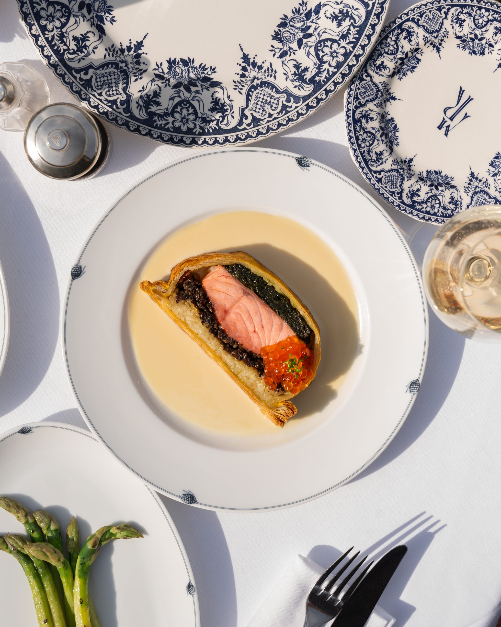 A blend of rich, flaky pastry, tender salmon, and velvety beurre blanc, balanced by the umami depth of mushroom duxelle and the fresh brightness of spinach. The cured salmon eggs add a luxurious burst of salinity.