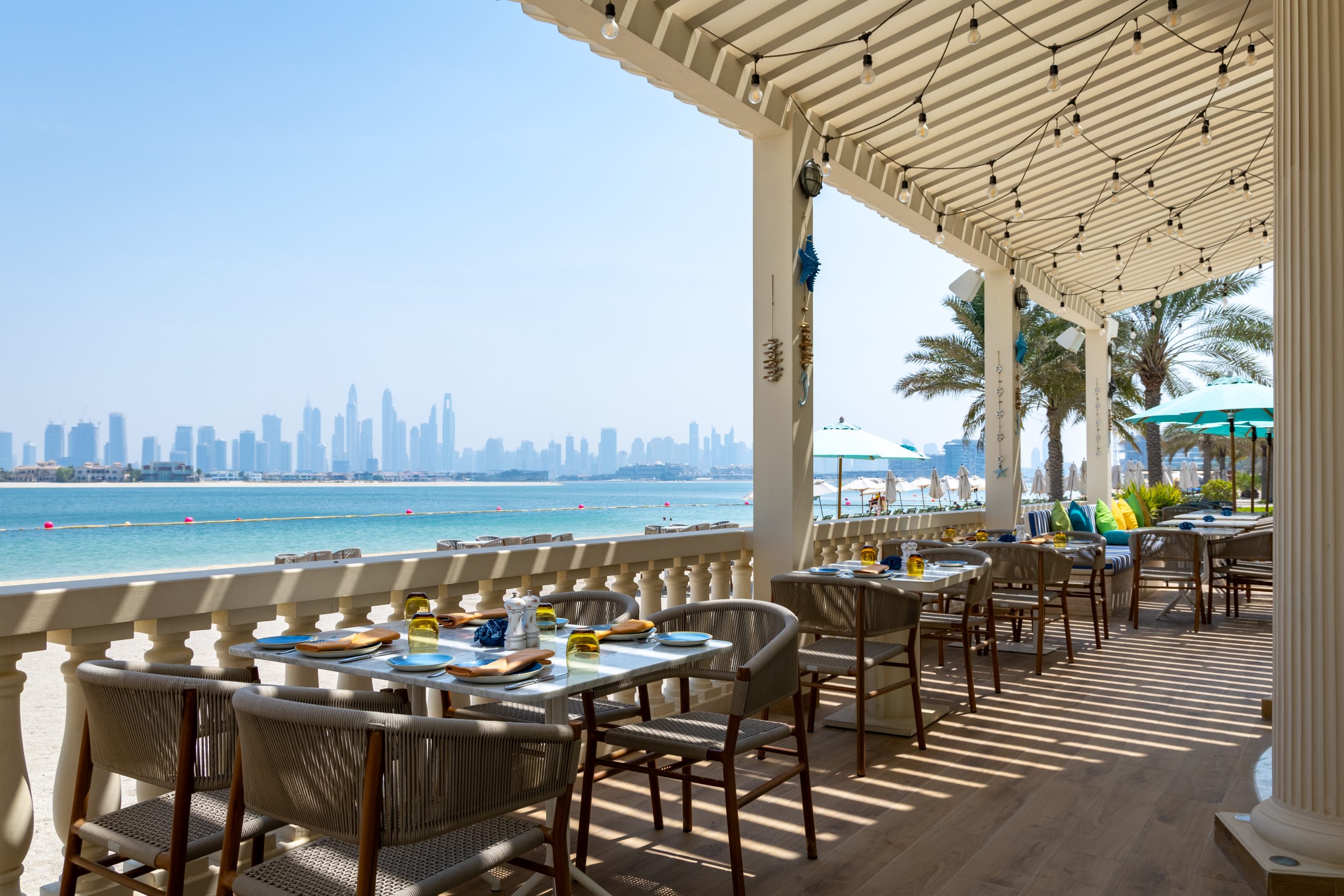 As the day transitions from leisure to evening, the focus naturally shifts to dining, and Villamoré offers the perfect complement to a day at Kempinski. Tucked within the hotel’s grounds, this Mediterranean-inspired restaurant brings the flavours of the coast to Dubai. Sunlight filters through white and blue umbrellas, a gentle sea breeze drifts across open terraces, and panoramic views of the skyline set the scene for comforting meals.