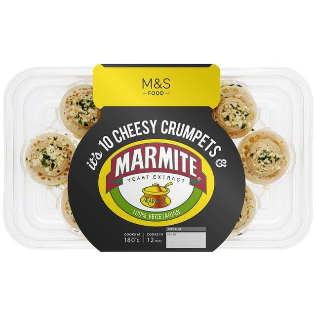 10 Cheesy Marmite Crumpets (205g), AED 65 – Ten mini crumpets topped with gooey mature cheddar cheese rarebit and melted Marmite® topped with parsley.