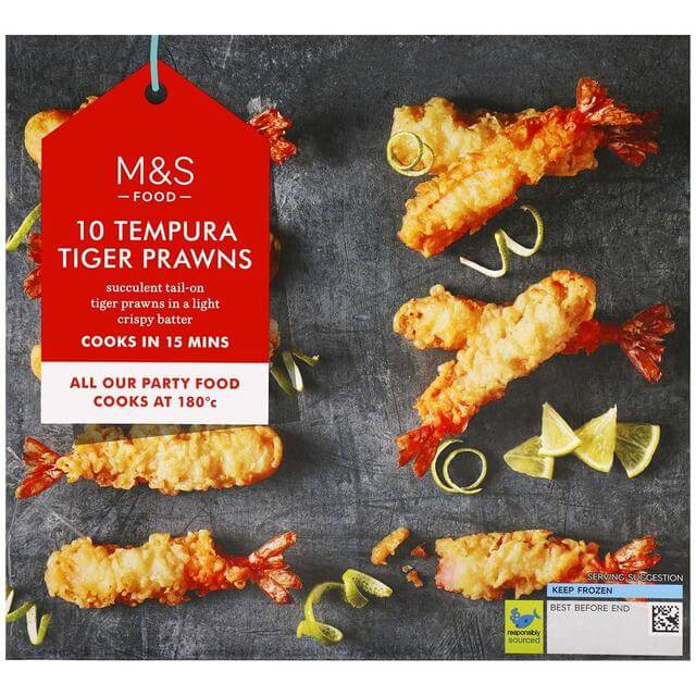 10 Tempura Prawns (120g), AED 65 – Succulent tail-on tiger prawns from Marks & Spencer assured farms, in a light crisp batter.