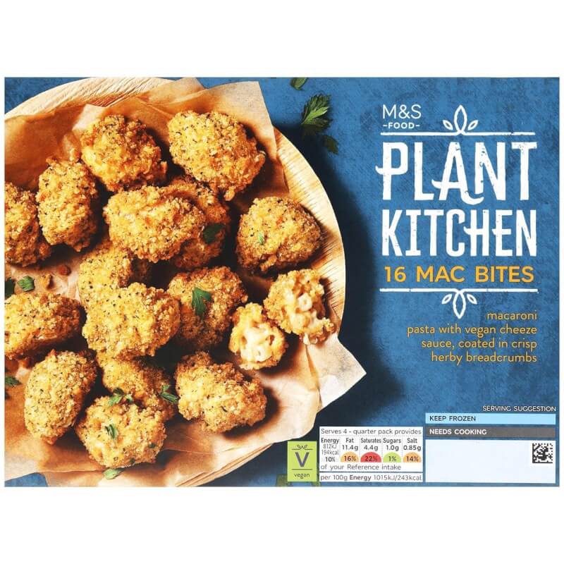 Plant Kitchen 16 Mac & Cheese Bites (320g), AED 45 – Macaroni pasta with a vegan coconut-based cheese alternative sauce, coated in crisp herby breadcrumbs.