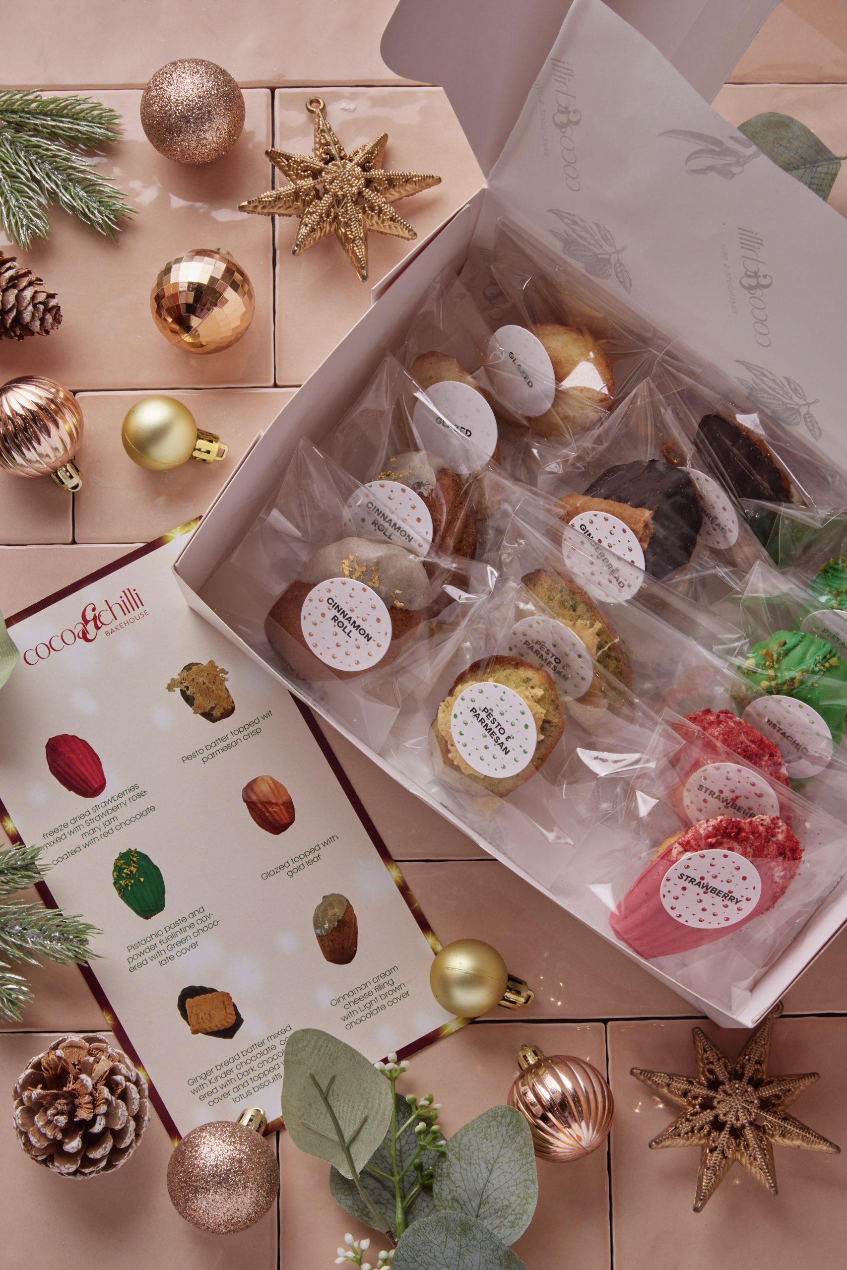 Enjoy a selection of 12 Madeleines in six unique flavours: pistachio, strawberry, cinnamon, gingerbread with chocolate, vanilla, and pesto with parmesan crisp.