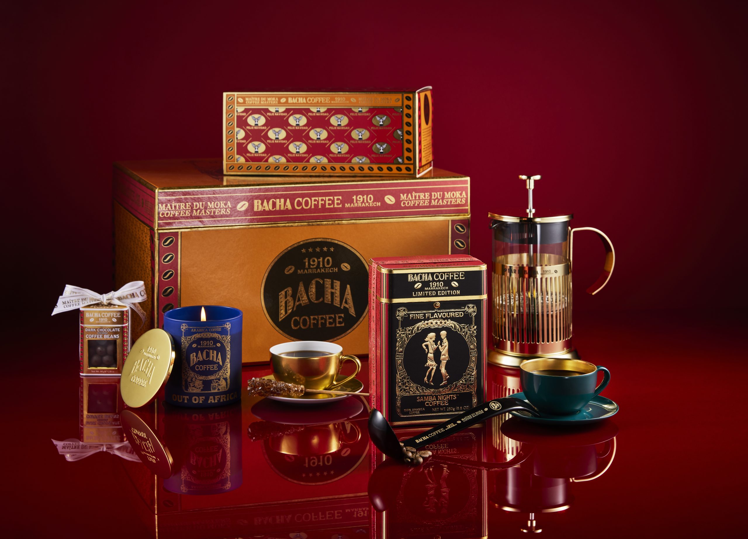 This coffee lover’s hamper, packed with everything from Samba Nights Coffee to gold coffee cups.