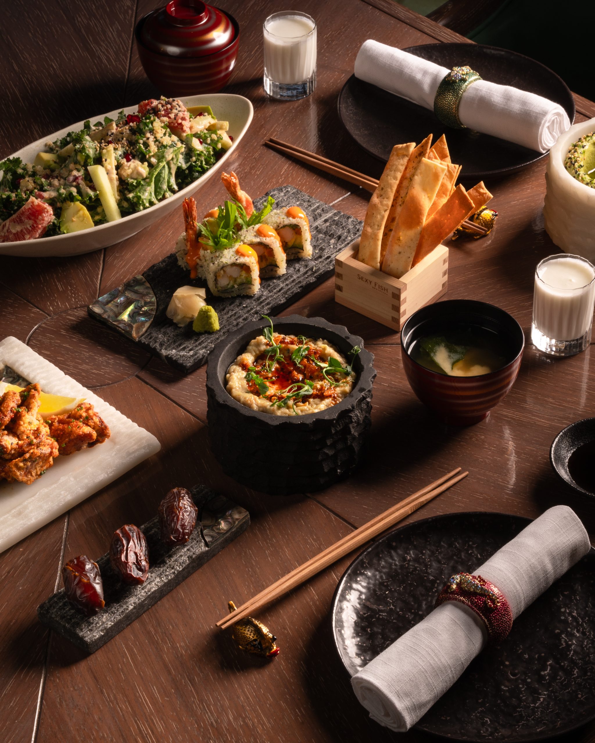 Sexy Fish Dubai offers a unique Issho Iftar experience in a laid-back setting with views of the Dubai skyline. The menu features a variety of light starters, including dates, laban, miso soup, edamame hummus, prawn tempura maki, and crispy chicken kaarage. Main course options include tender baby chicken, juicy lamb chops, or salmon teriyaki, with a spiced sticky date pudding to finish the meal on a sweet note.