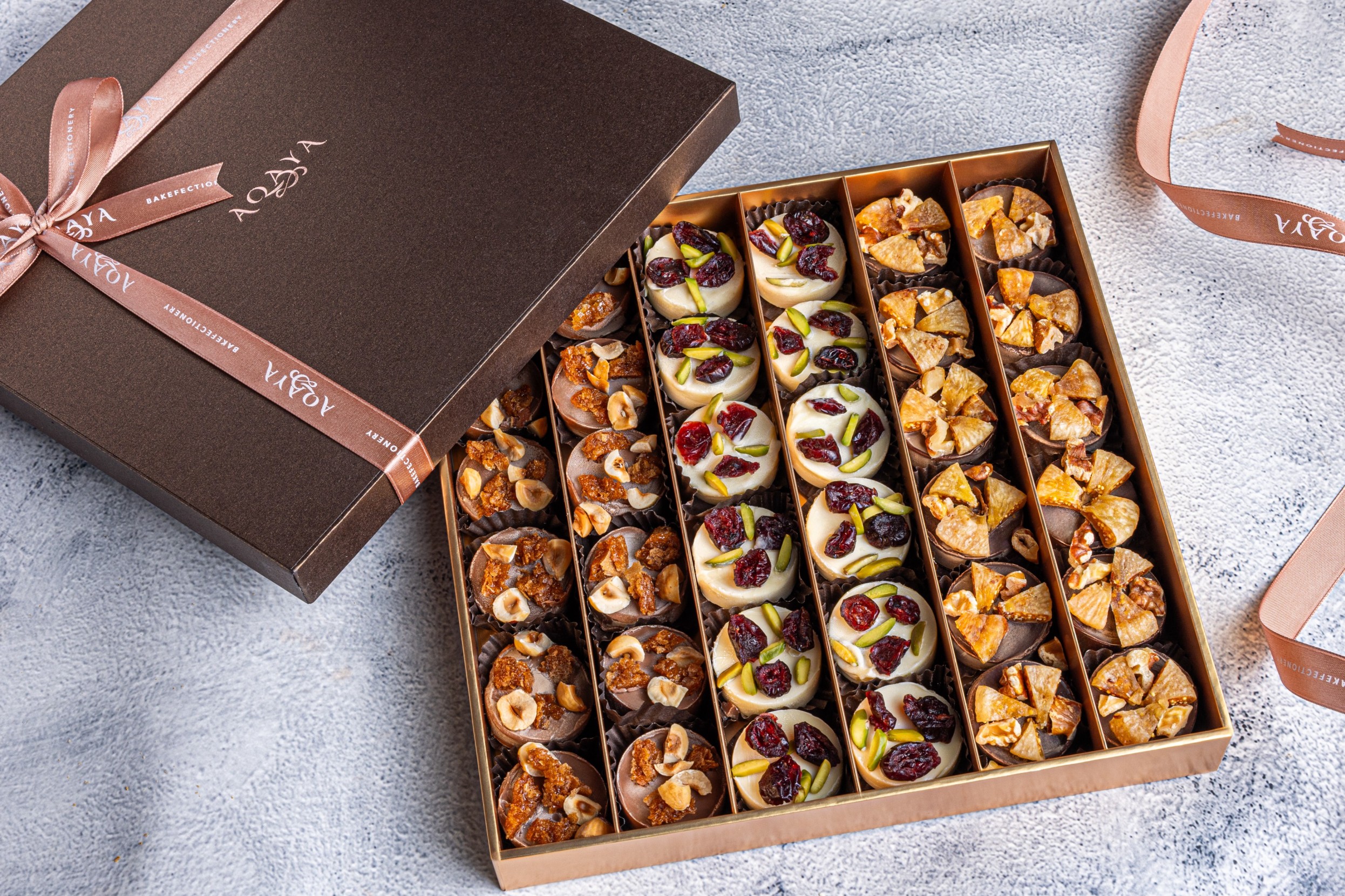 Indulge in Aqaya’s handcrafted Mendiants in flavours such as white chocolate with roasted pistachio and dried cranberry, milk chocolate with roasted hazelnut and crunchy feuilletine, and dark chocolate with roasted walnut and dried figs.