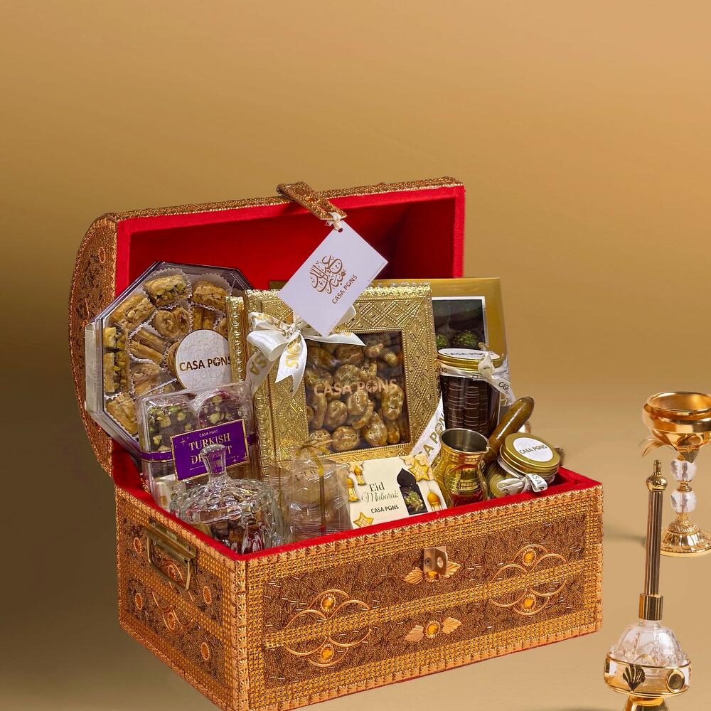 Presented in a gold treasure basket, this premium selection of Arabic treats, including pistachio maamoul and baklava, makes a thoughtful gift.