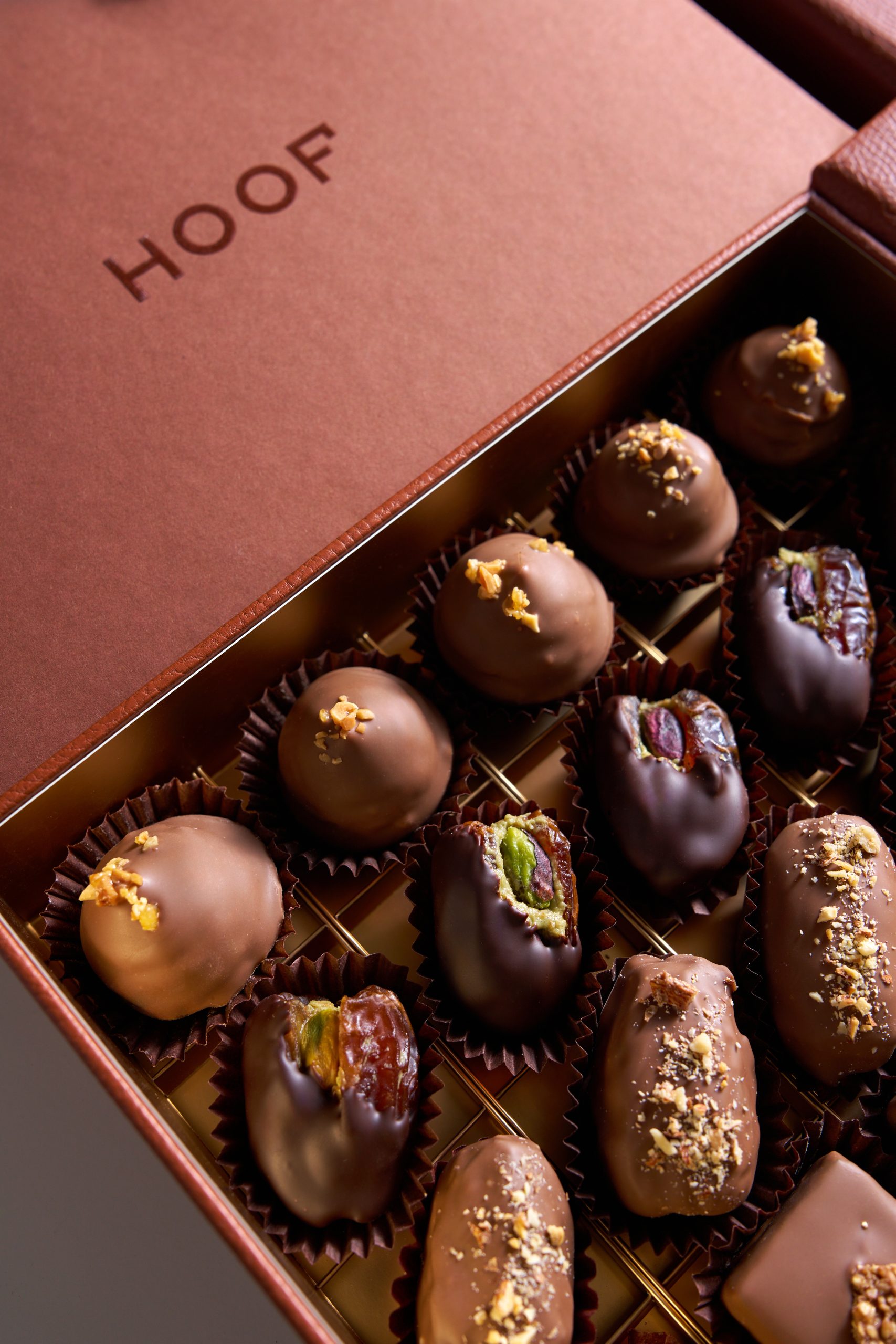 Featuring 20 handcrafted chocolates, the Hoof Assorted chocolate box features hazelnut praline bon bon, dates & pistachio crunch, dates & almond gianduja, and tahini milk chocolate bites, this limited-edition box is thoughtfully designed for gifting and sharing.