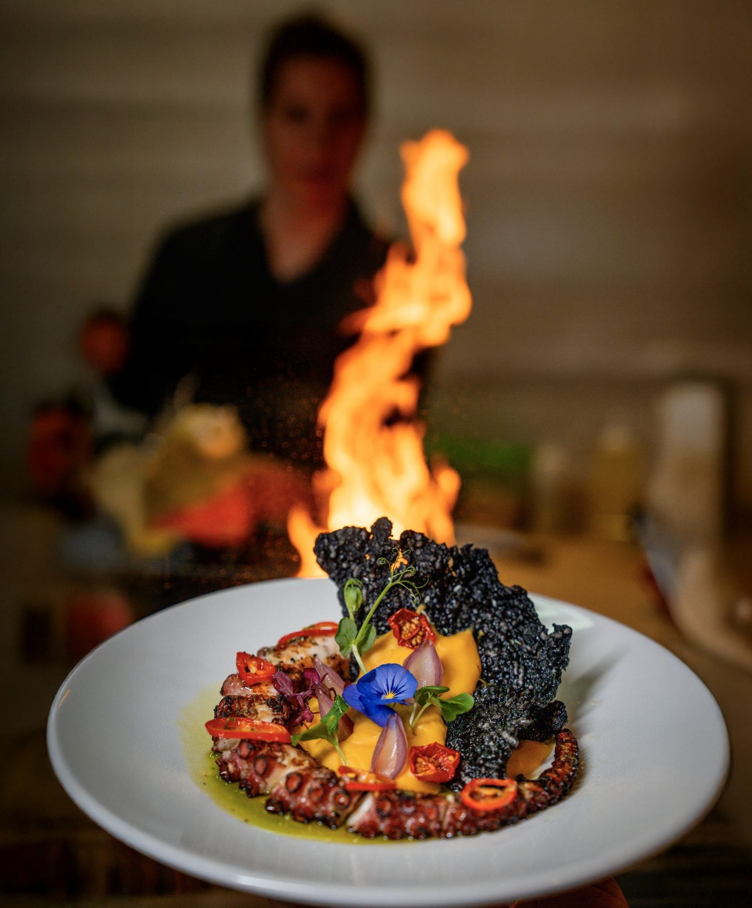 Led by Chef Alexandros Sperxos, the restaurant showcases over 20 years of expertise through an innovative menu and immersive dining experience. The sleek open kitchen allows guests to watch chefs in action, creating beautifully plated dishes cooked over open flames.