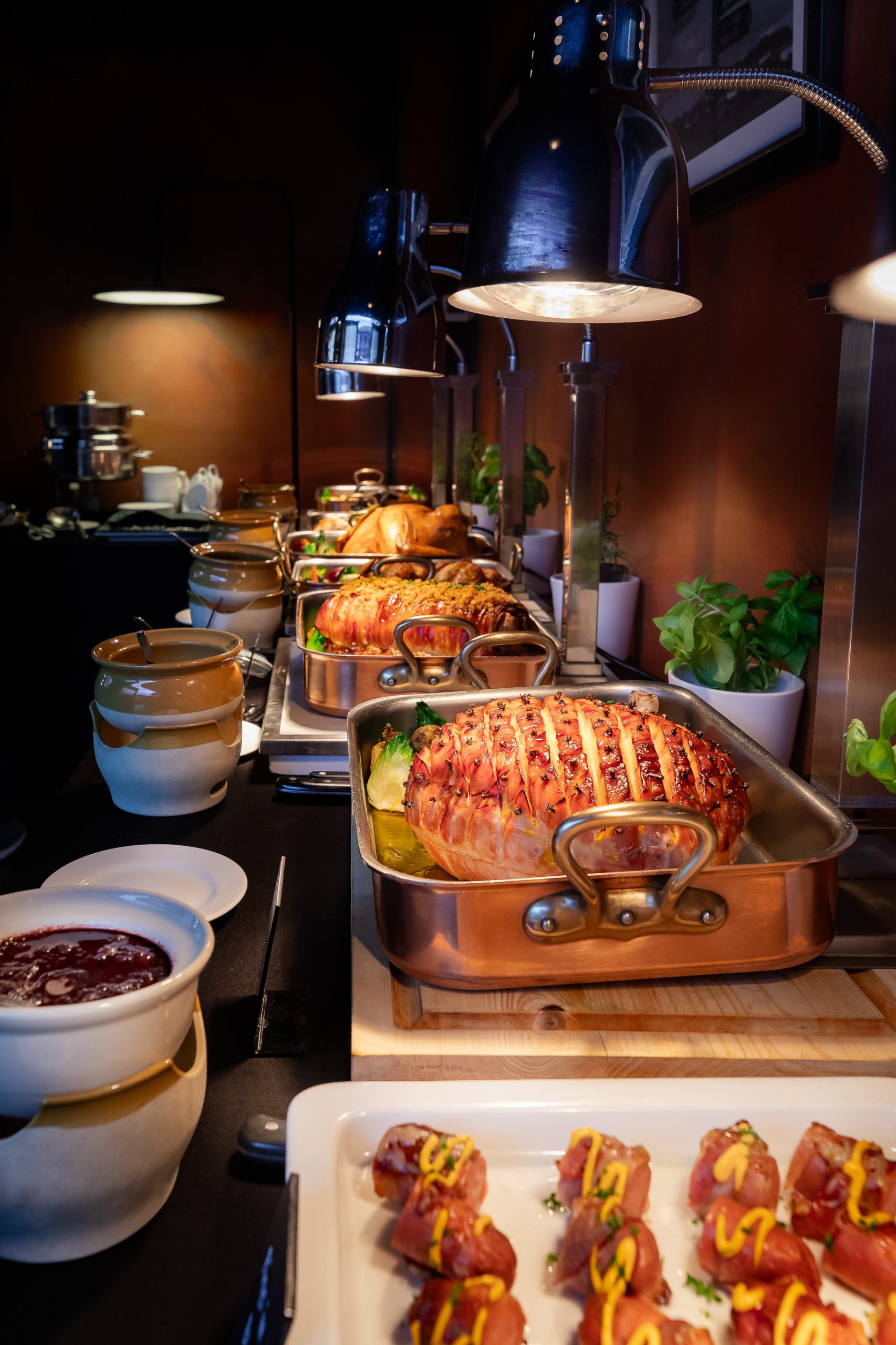 At the heart of the spread is a line-up of perfectly cooked meats carved to order. Expect tender roasted beef, flavourful leg of lamb, paprika-spiced chicken, and non-halal meats. Each plate is served with classic British accompaniments – crisp Maris Piper roast potatoes, golden Yorkshire puddings, buttery seasonal vegetables, creamy cauliflower cheese, and plenty of rich, homemade gravy to bring it all together.
