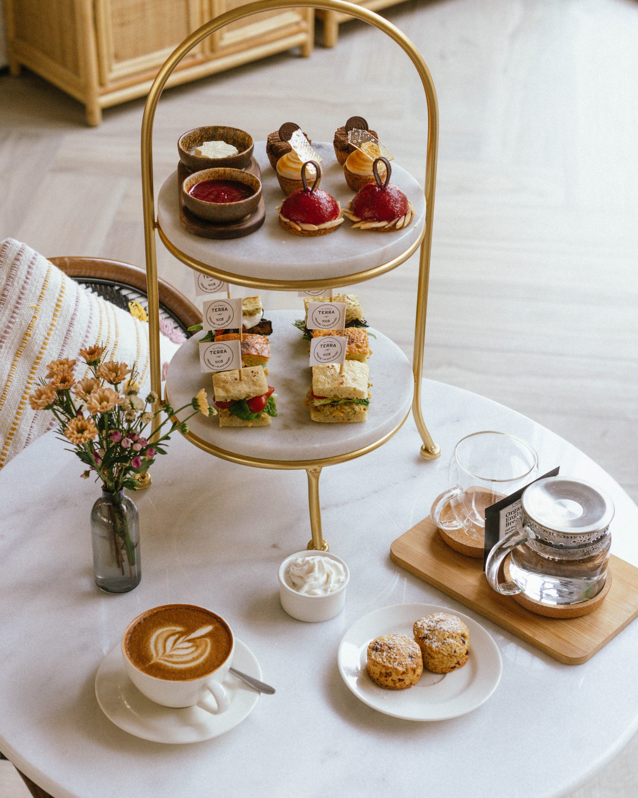 Guests can savour a delightful vegan Afternoon Tea experience at Planet Terra, featuring an array of vegan finger sandwiches, desserts, scones with homemade butter, berry jam, and vanilla cream, accompanied by organic coffee and tea with plant-based milk options like almond, soy, oat, and coconut.
