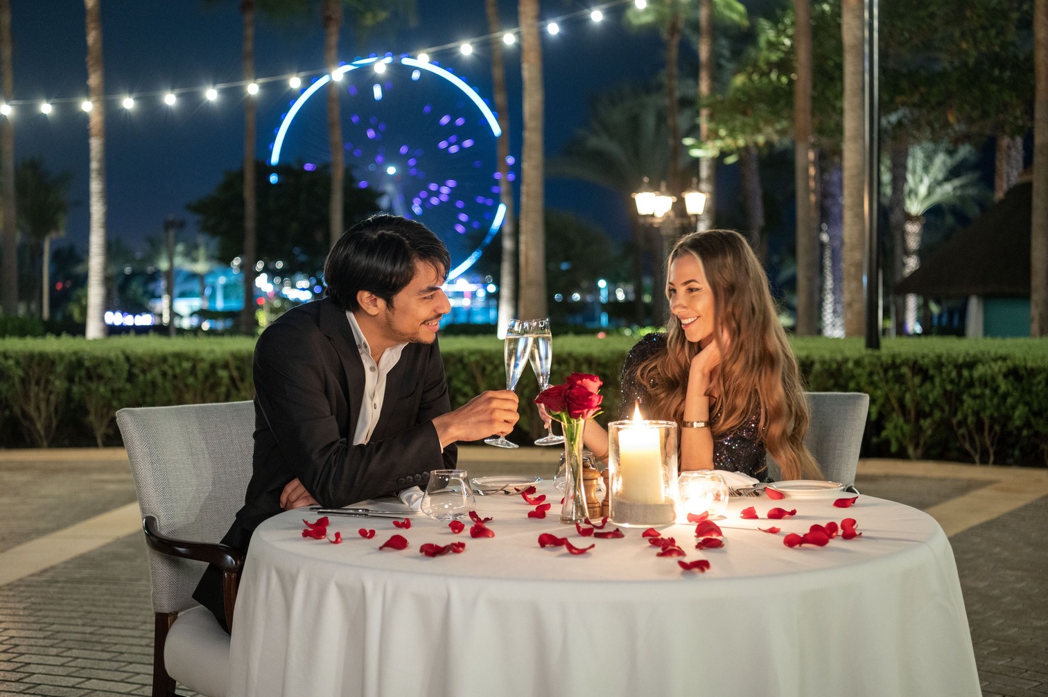 AED700 per couple for a 4-course set menu dinner paired with a bottle of sparkling grape and AED999 per couple for a 4-course set menu dinner paired with a