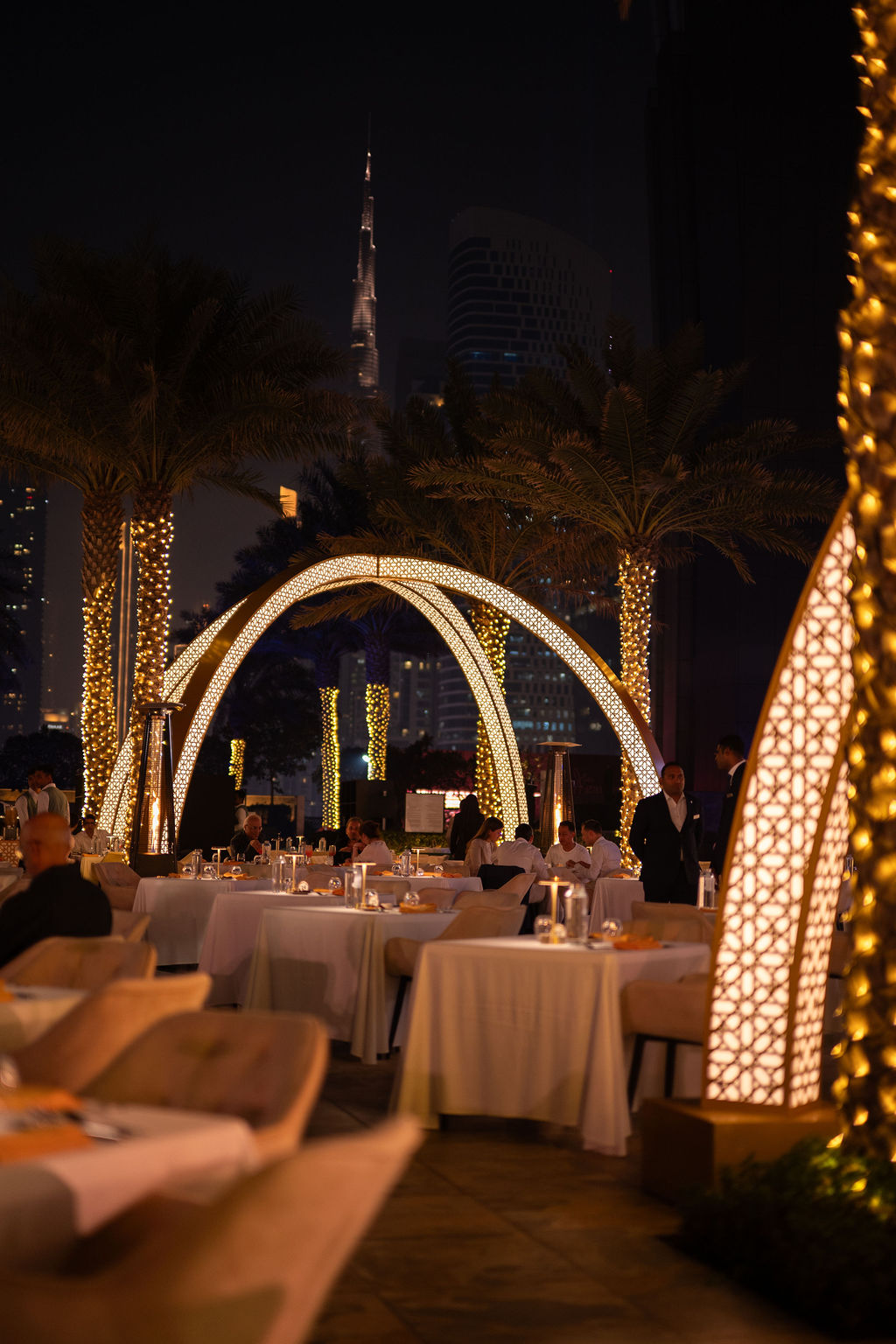 Named for the moon, Al Qamar Iftar unfolds on The Terrace beneath the stars, with views of the Burj Khalifa and the sound of live oud music drifting through the venue. The buffet spans a wide culinary landscape from Asian wok stations and Middle Eastern grills to Indian tandoors and Western classics. Traditional highlights include whole lamb ouzi, a shawarma station and a variety of live cooking stations, anchoring the meal in familiar Ramadan flavours.