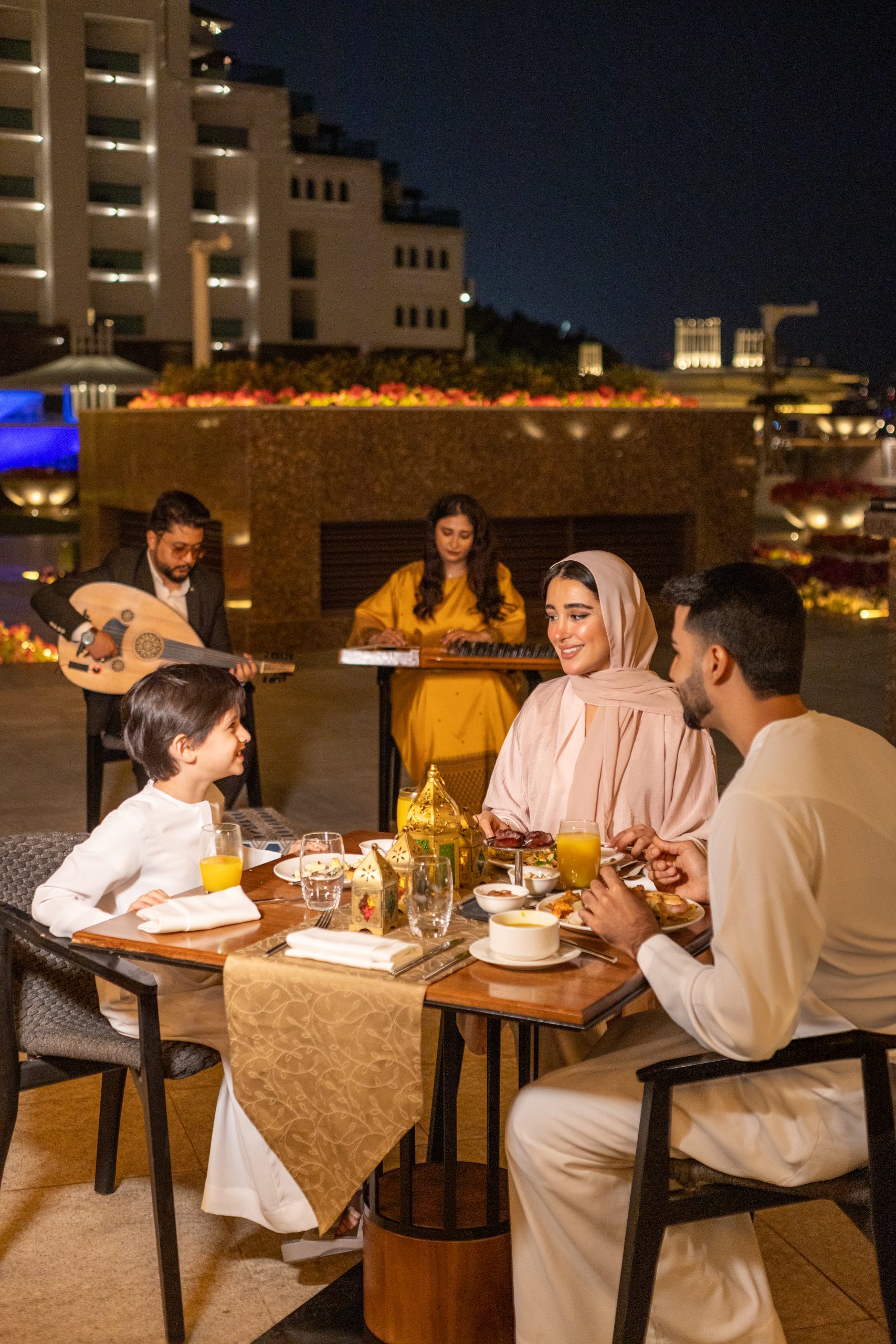 An abundant Iftar buffet featuring live cooking stations and traditional Ramadan favourites, complemented by live Oud and Qanun performances—creating a warm, relaxed, and celebratory atmosphere for families and friends.